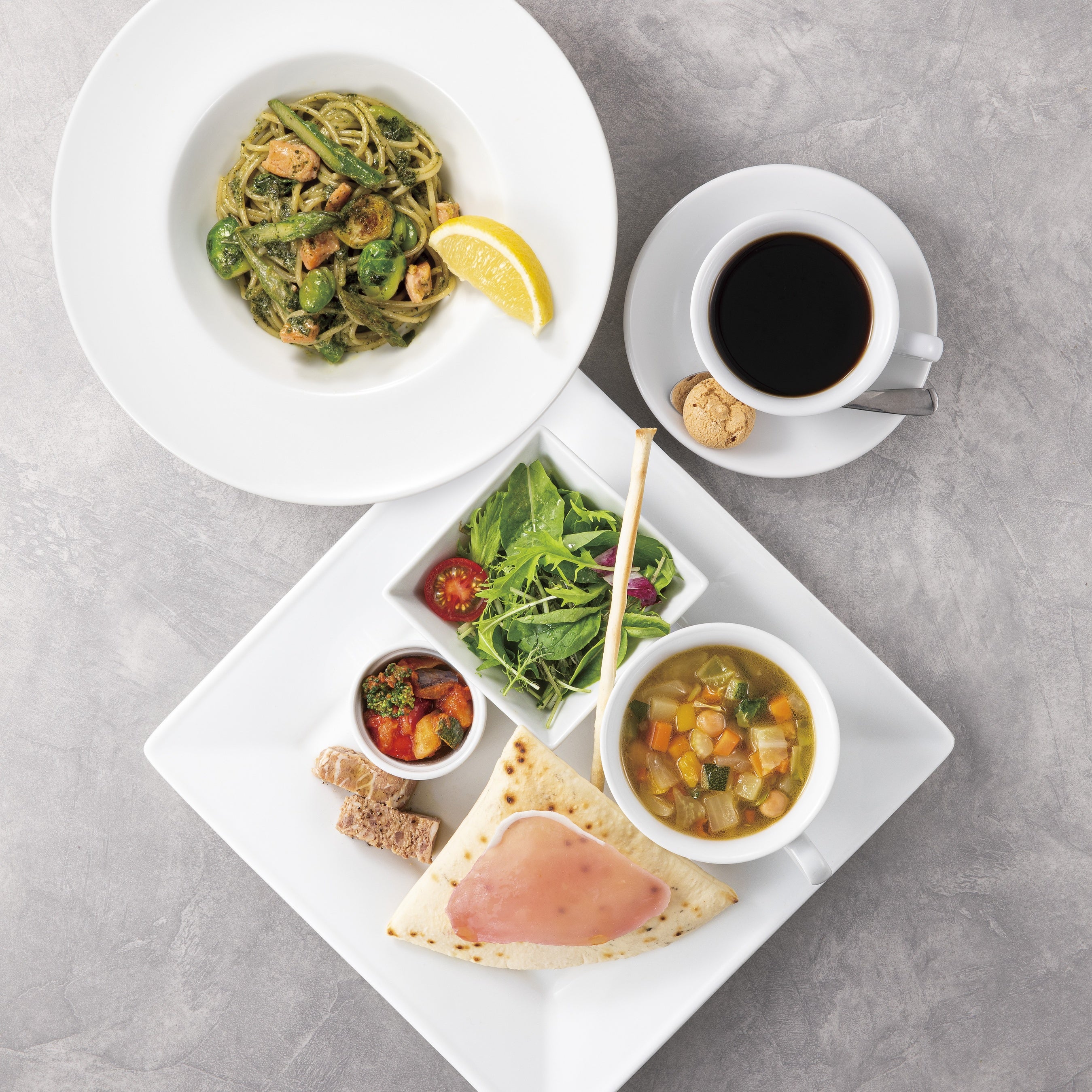 また、前菜からメインまで一度に少しずつ色々楽しみたい方のために、サラダ、前菜2種、スープ、窯焼きパンを盛り付けた前菜プレートと、ハーフサイズの「春野菜とサーモンのジェノベーゼクリームスパゲッティ」、そしてドリンクがセットになった「季節のピアットウニコ」としてもご用意しております。