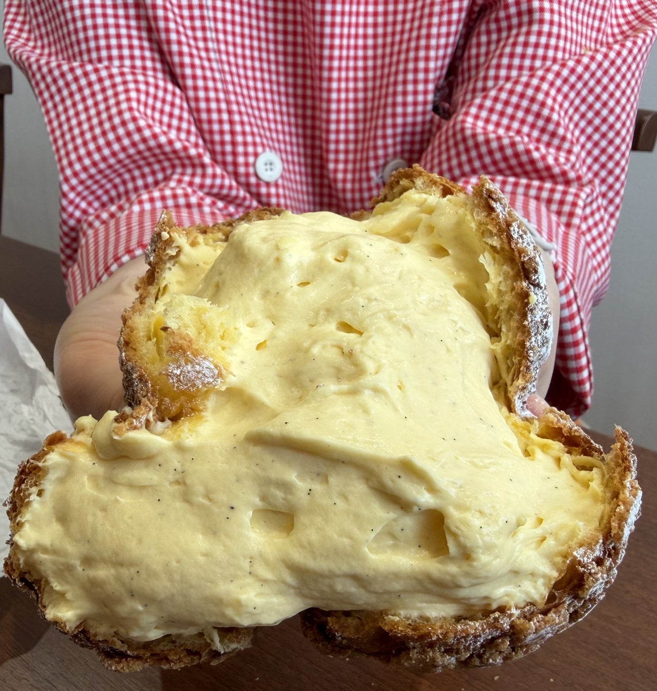 手にした瞬間に感じる、シュークリームとは思えないほどの重量感。中には、パティシエが4年の歳月をかけて完成させた特製カスタードクリームが200gも溢れんばかりに凝縮されています。自分へのご褒美にはもちろん、シェアしても楽しめる驚きのボリュームです。