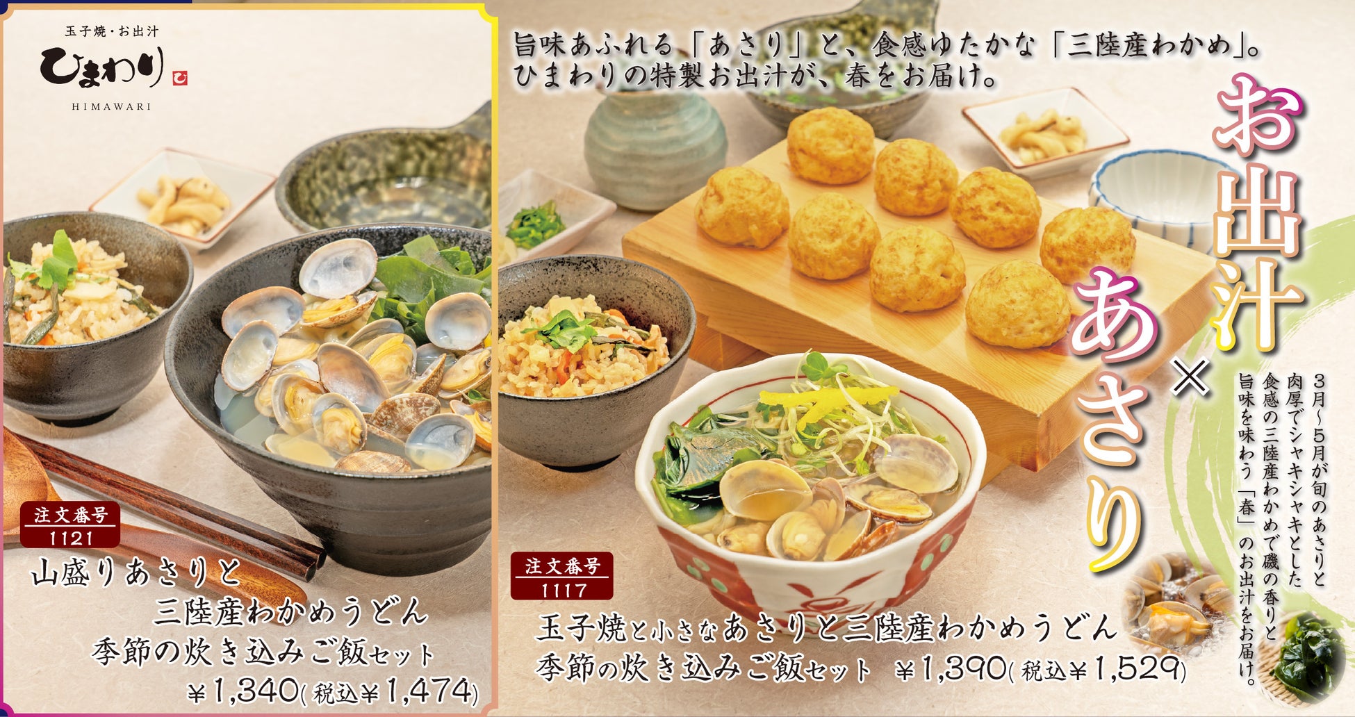 旨味あふれる「あさり」と、肉厚でシャキシャキとした食感の「三陸産わかめ」で磯の香りが楽しめる!ひまわりの特製お出汁が春をお届けします。
