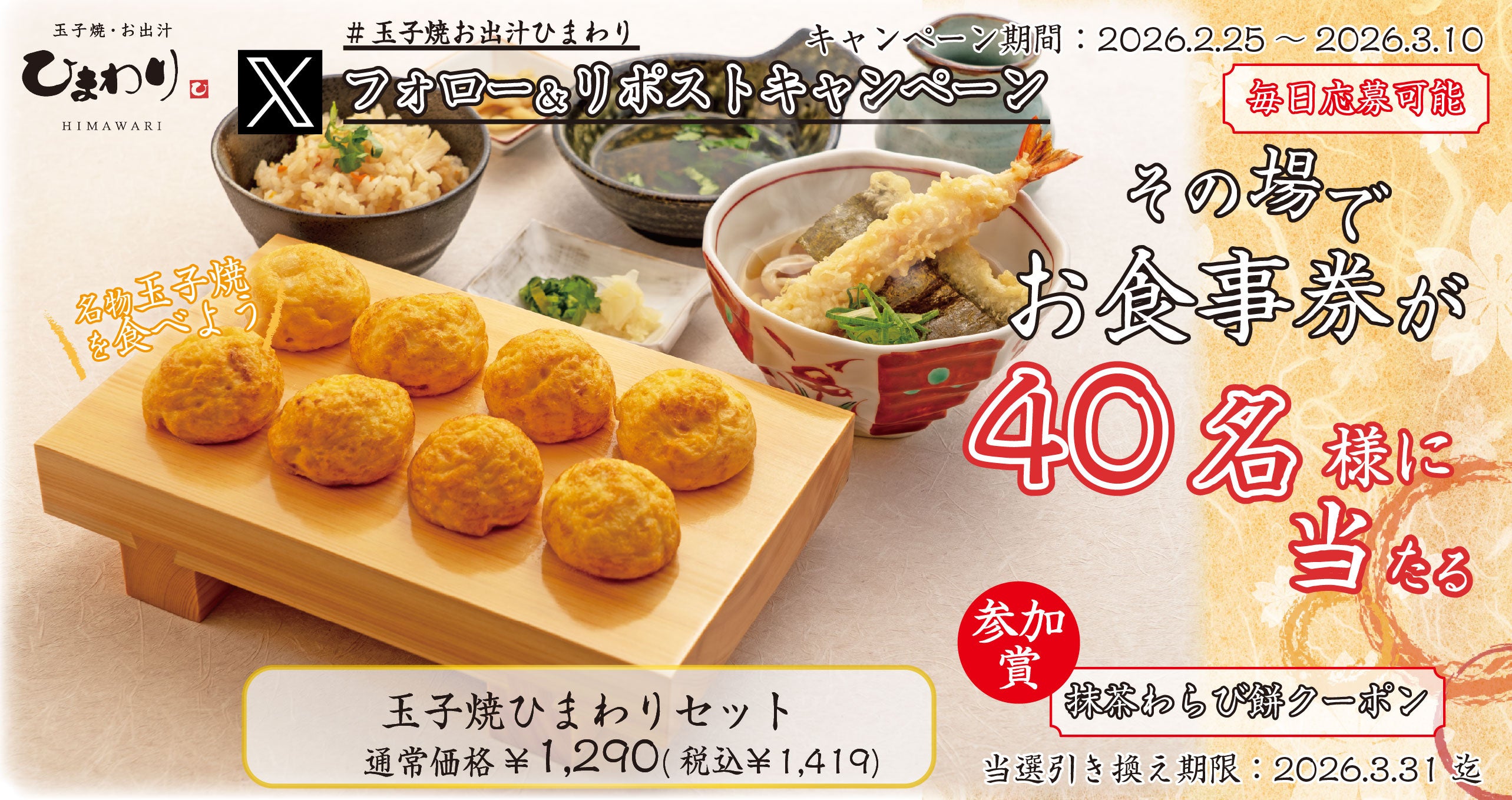 あわせて、玉子焼・お出汁ひまわり公式Xアカウントをフォロー&リポストして応募すると、抽選で40名様に「玉子焼ひまわりセット1人前(税込み1,419円)」をお召し上がりいただけるデジタルお食事券プレゼントキャンペーンを2026年2月25日(水)より開催中です。