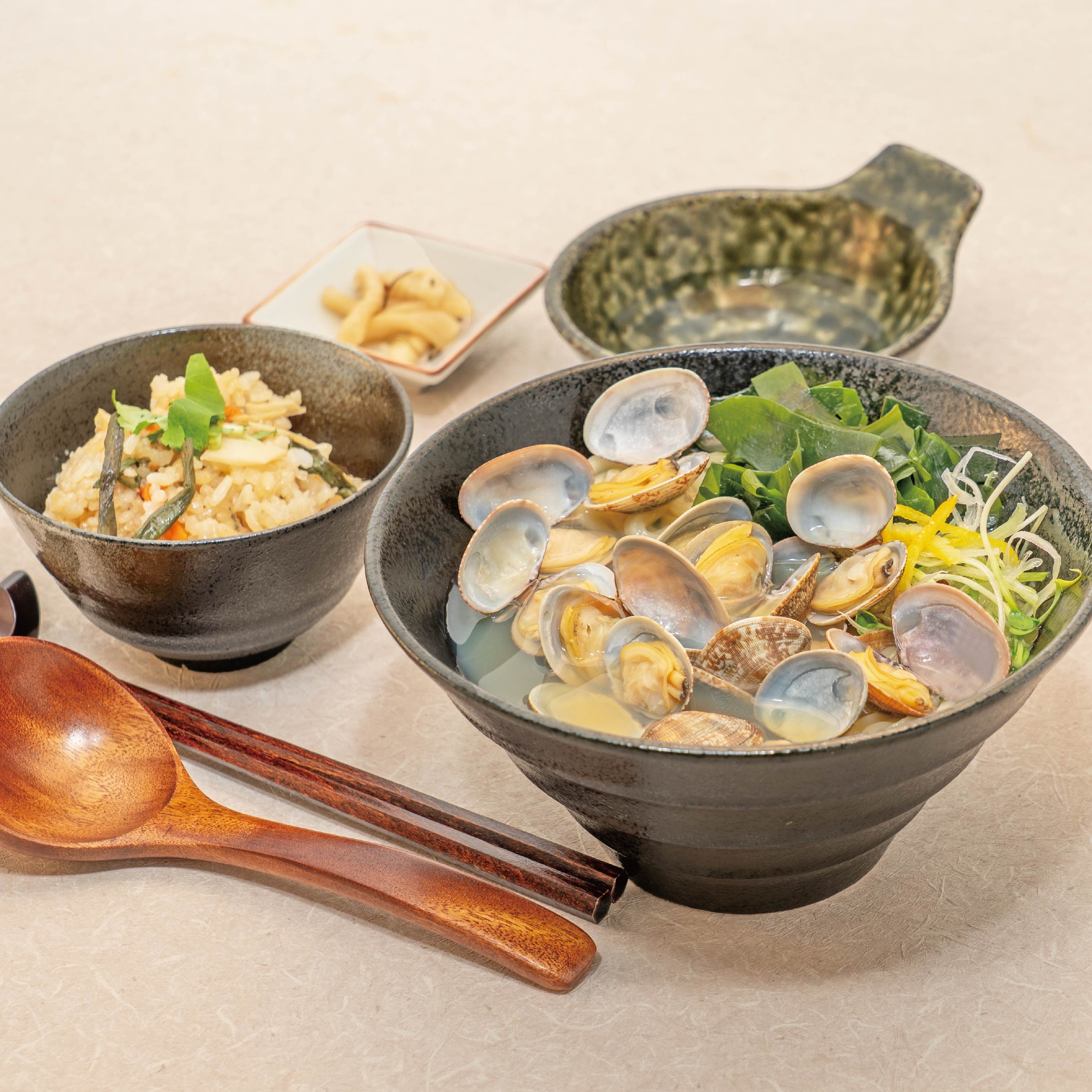 ●山盛りあさりと三陸産わかめうどん 季節の炊き込みご飯セット 1,340円(税込み1,474円)