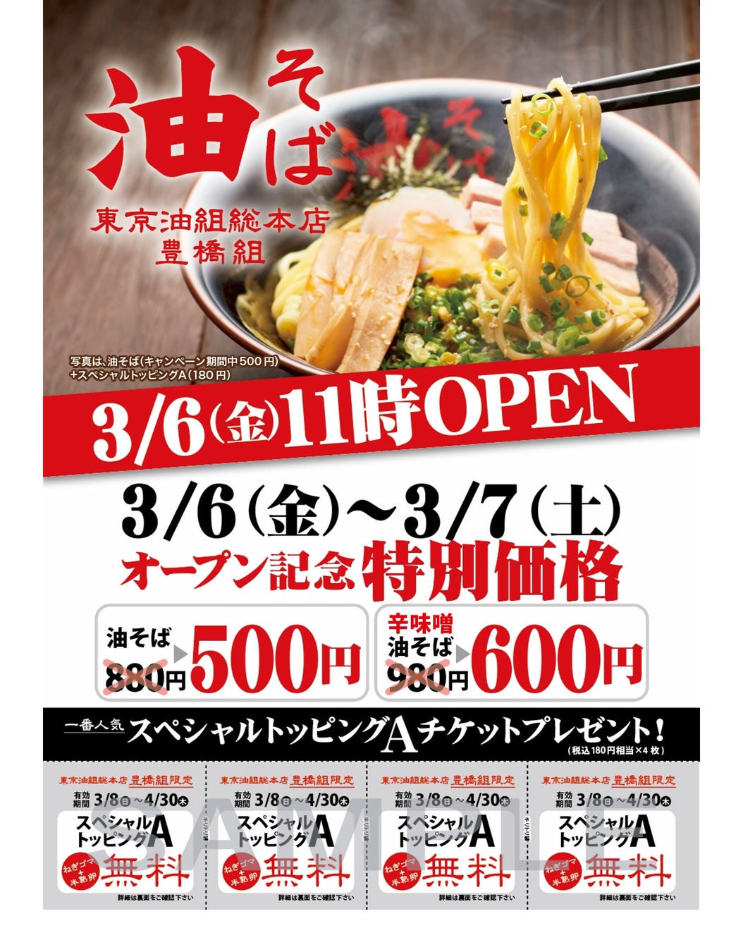 『東京油組総本店 豊橋組』の出店を記念し、2026年3月6日(金)・ 7日(土)の2日間、「油そば」 と 「辛味噌油そば」 を特別価格でご提供いたします!(東京油組総本店 豊橋組のみで実施)
