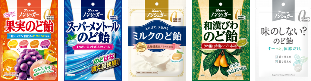 ジューシーな果物の味わいが楽しめる「ノンシュガー果実のど飴」、強烈なメントールが特徴の「ノンシュガースーパーメントールのど飴」、コク深いミルクにほんのりミントが香る「ノンシュガーミルクのど飴」、ハーブの香りで優しくうるおう「ノンシュガー和漢びわのど飴」の4種類を展開。2025年9月には、甘さも香りも気にならない“すーっと、体感だけ”を実現した「ノンシュガー味のしない?のど飴」を発売し、多くのお客様にご愛顧いただいております。