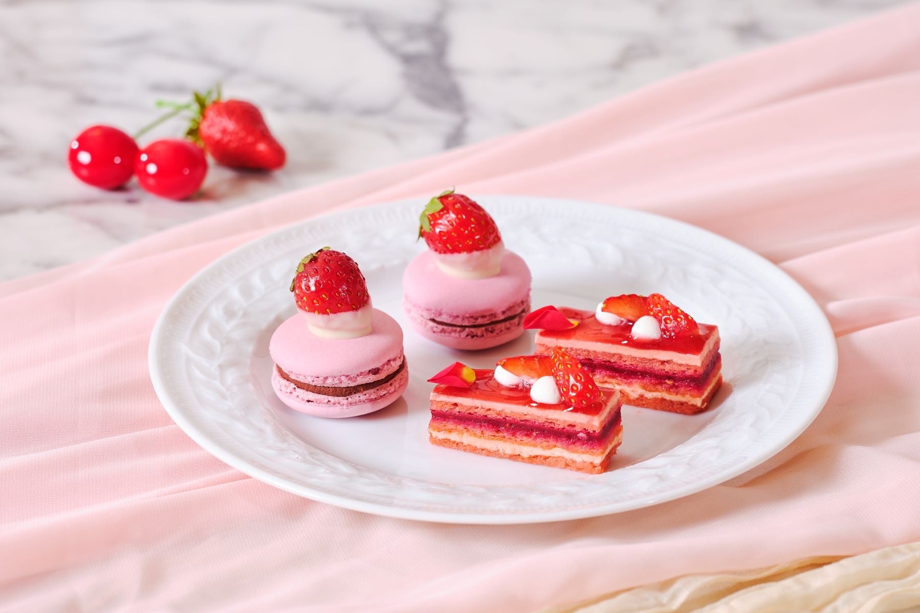 甘酸っぱい果実と軽やかなムースが調和する、清涼感あふれるいちごとチェリーのヴェリーヌをはじめ、スポンジといちご風味のバタークリームやジャムが美しい層を織りなすオペラ、サクッとした食感がアクセントの絞りだしクッキー、甘酸っぱいフランボワーズとコク深いミルクチョコレートのガナッシュを贅沢に閉じ込めたいちごマカロンなど、旬のいちごを中心としたスイーツをラインナップ。