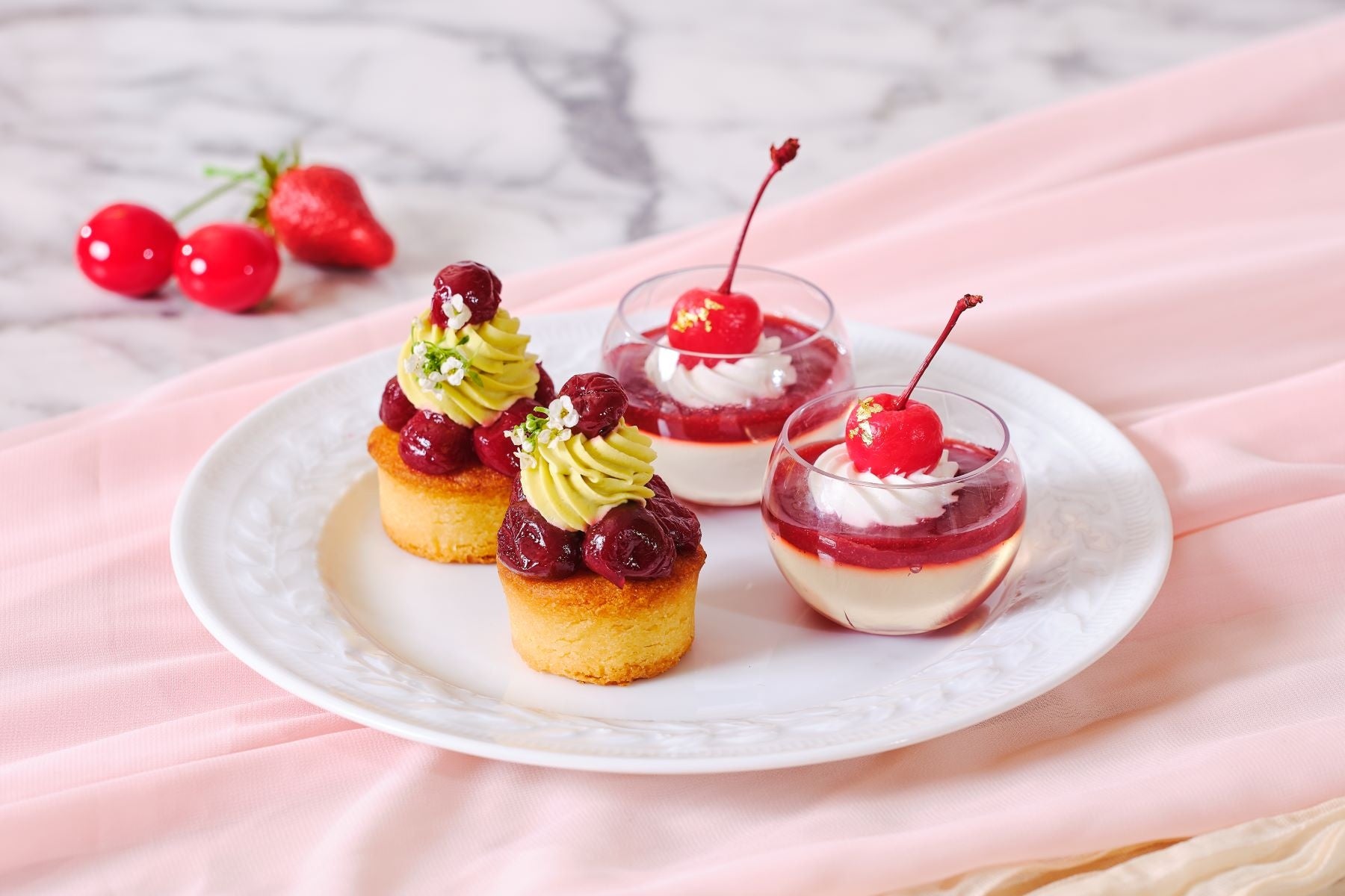 その他、チェリーづくしのスイーツとして、つやつやとした真っ赤なグラサージュが目を引く本物のチェリーに見立てたムースや、しっとりと焼き上げたタルトに、ピスタチオの芳醇な風味とチェリーの果肉が優しく重なるタルト、口の中でとろけるような食感と果実の爽やかさが優雅に合わさるチェリーと白ワインのジュレを含むパティシエこだわりのスイーツ7種をご用意。