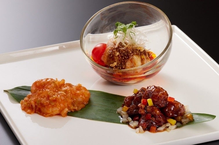 本格中国料理SHI-ENの人気料理、四川名菜よだれ鶏、エビのチリソース、黒酢の酢豚の三種盛り。