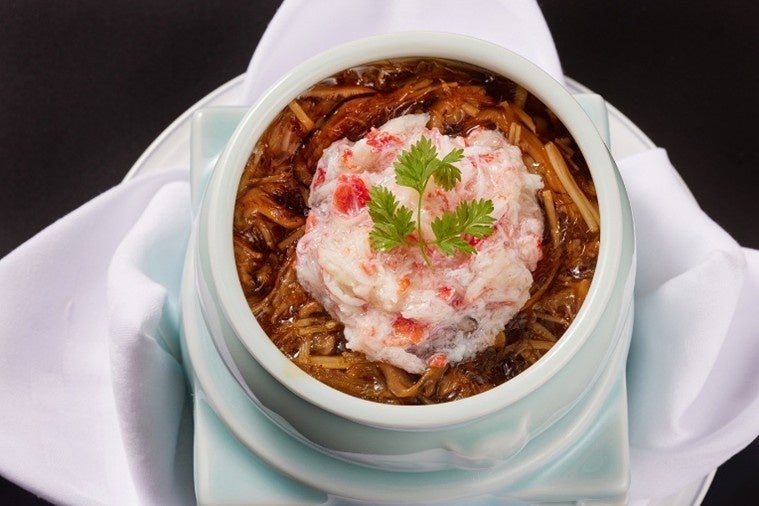 佐渡産本ズワイガニと毛ガニを使用した餡と、笹川流れの塩・醤油・中国醤油で味付けしたフカヒレスープを合わせた一品。