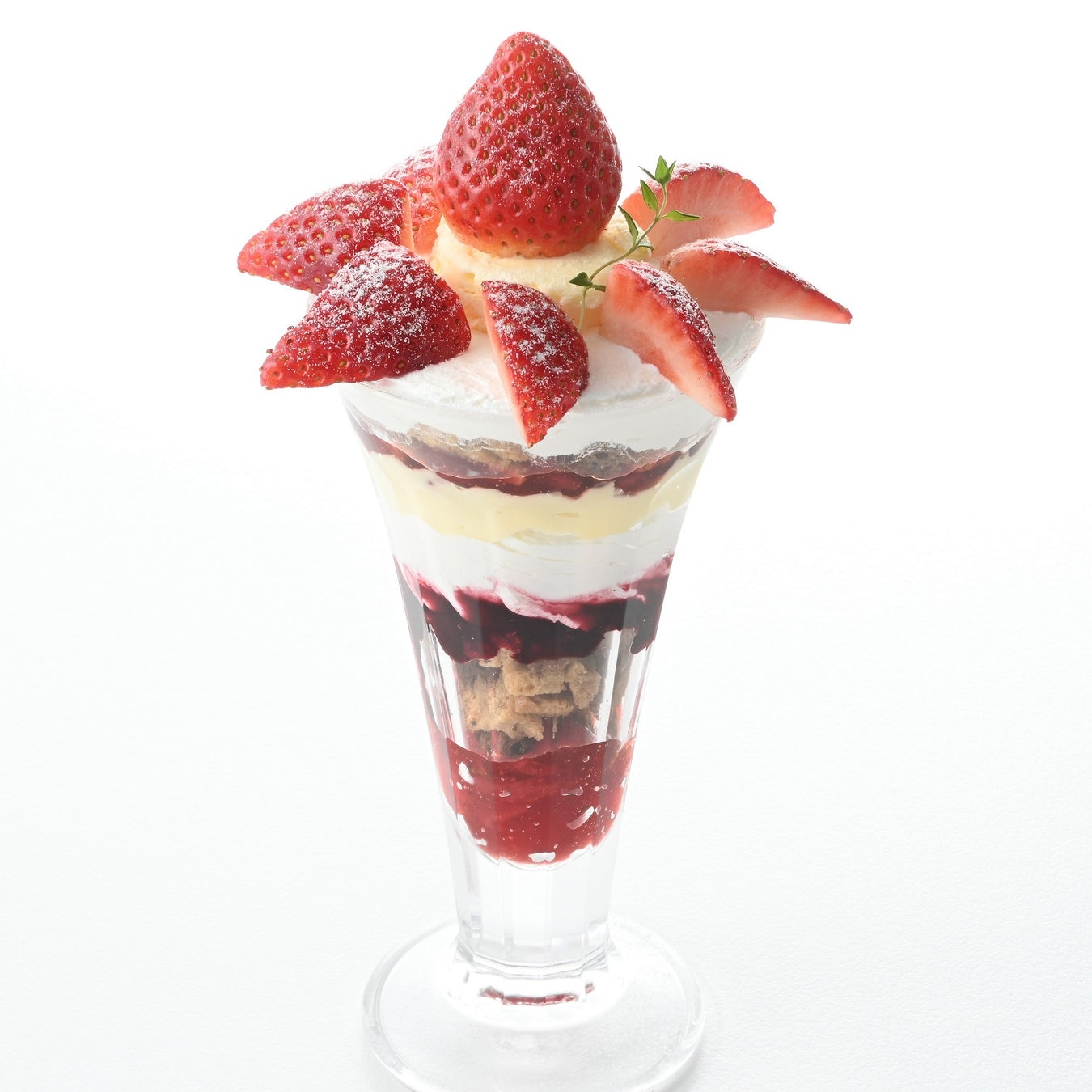 花びらをイメージしたいちごに、ホイップクリームやとろとろカスタードを重ねた華やかなパフェ。果肉入りいちごジャムやカシスソースをプラスして、奥行きのある味わいに仕上げました 。
