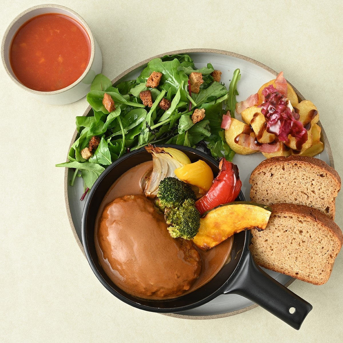 クリーミーなデミグラスソースのハンバーグに、グリル野菜やバルサミコポテトフライを添えた、デンマークの家庭料理をイメージした一品です 。セットのスープには、野菜の旨みを活かした「ミネストローネ」をあわせました。