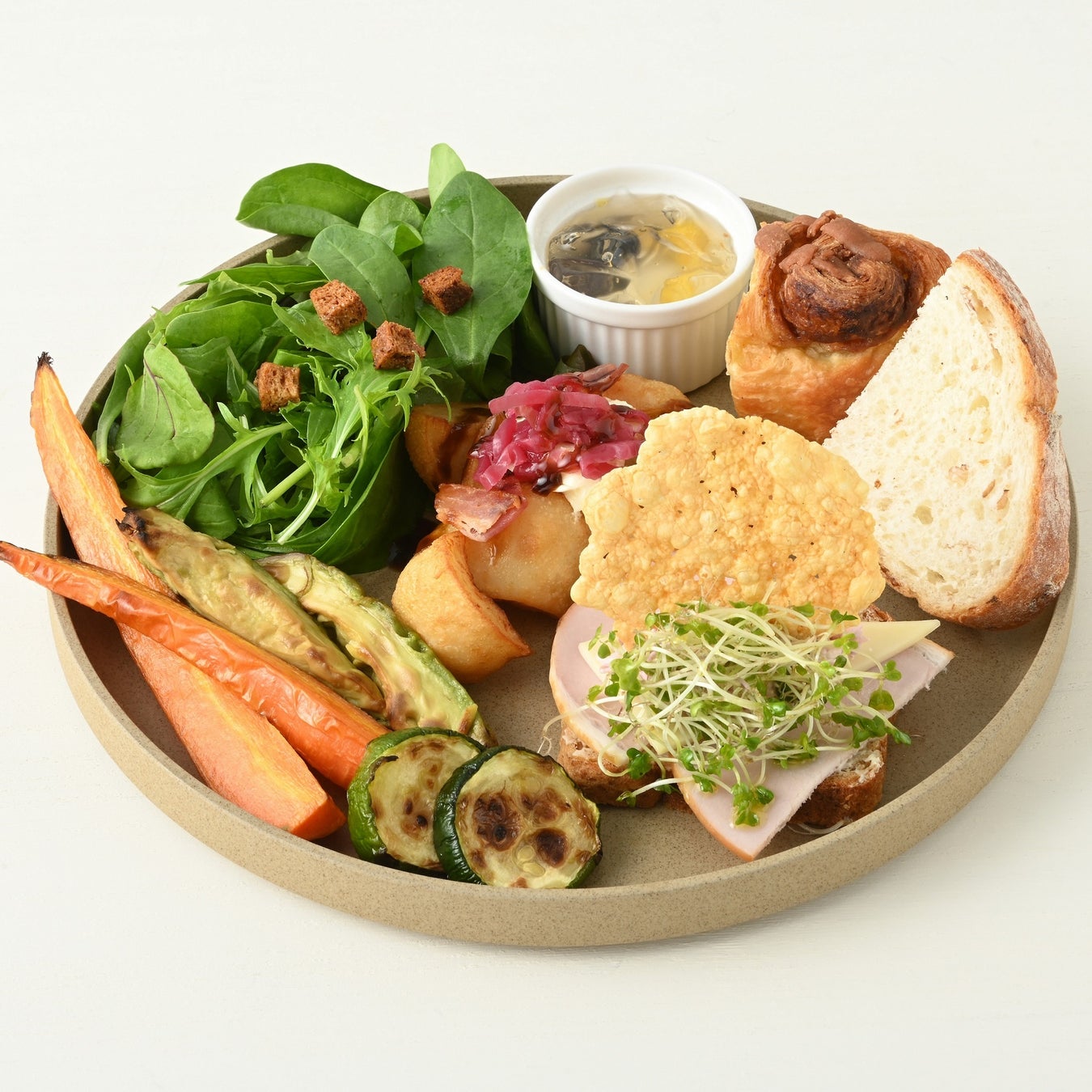 トマトと野菜を煮込んだ「ミネストローネ」をメインに、自慢のデニッシュを合わせた軽食プレート。グリル野菜、バルサミコポテトフライも付いた、満足感のあるセットです。