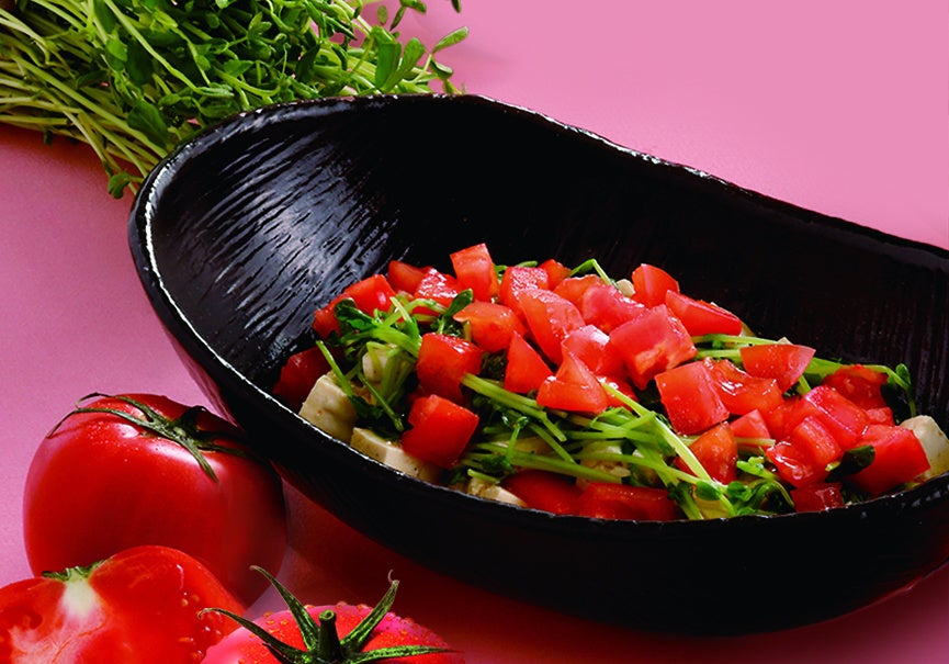 蒸してやわらかくした豆苗、爽やかな酸味のトマト、豆富に黒胡椒やレモンをきかせたオリーブオイルソースでさっぱりと仕上げた豆富サラダです。