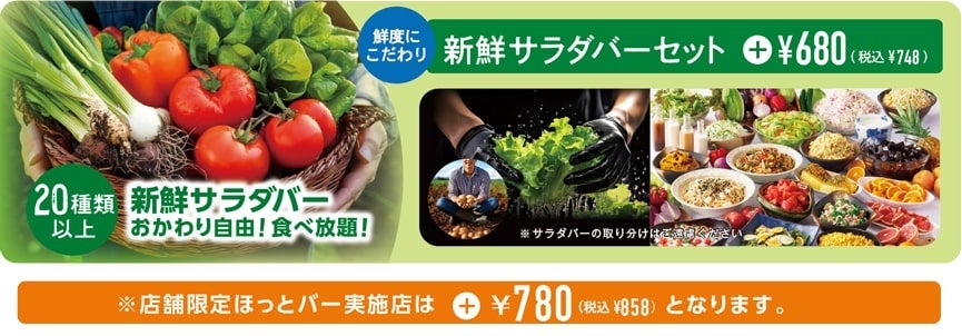 ※限定店舗だけのあったかメニューが楽しめるほっとバーを実施の店舗は、「ブロンコセット880円(税込968円」、 「新鮮サラダバーセット780円(税込858円)」となります