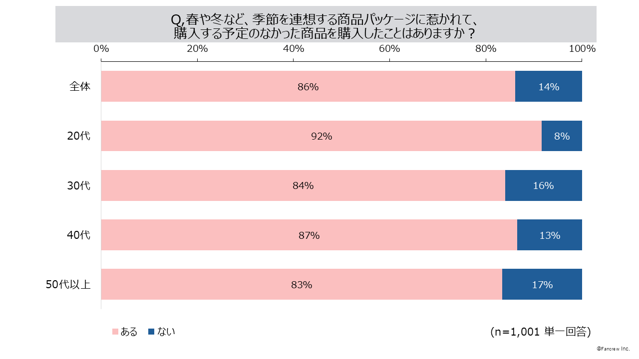 季節を連想する商品パッケージに惹かれて「購入予定のなかった商品を購入したことがある」86%