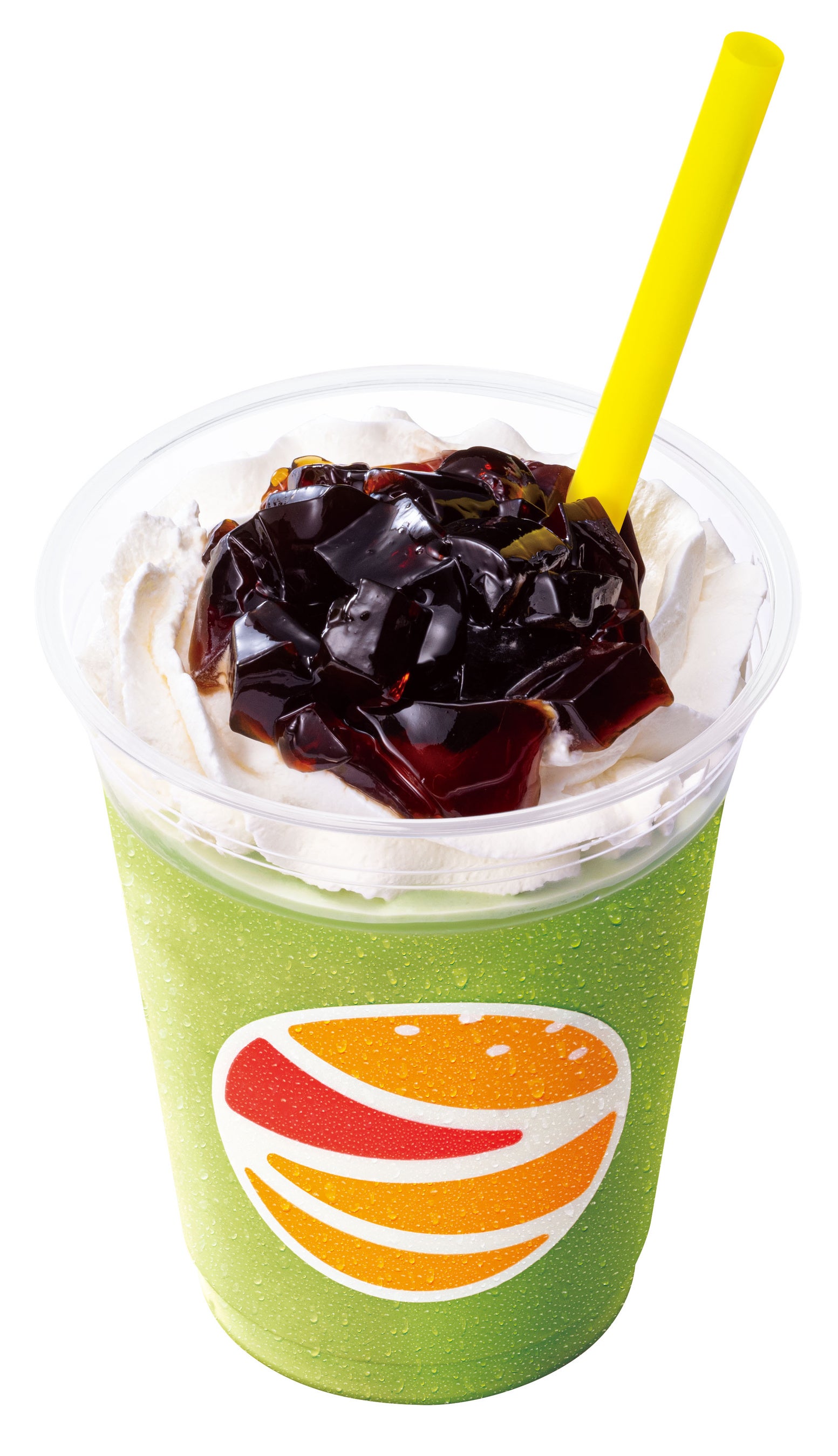 商品概要:抹茶を使用したシェーキに、口どけの良いホイップクリームと、沖縄県産黒糖を使用した黒糖ゼリーをトッピングした商品です。抹茶のほろ苦さと黒糖のやさしい甘みが絶妙に調和する“和風”シェーキに仕上げました。ぷるんとした黒糖ゼリーが食感にアクセントを加えます。