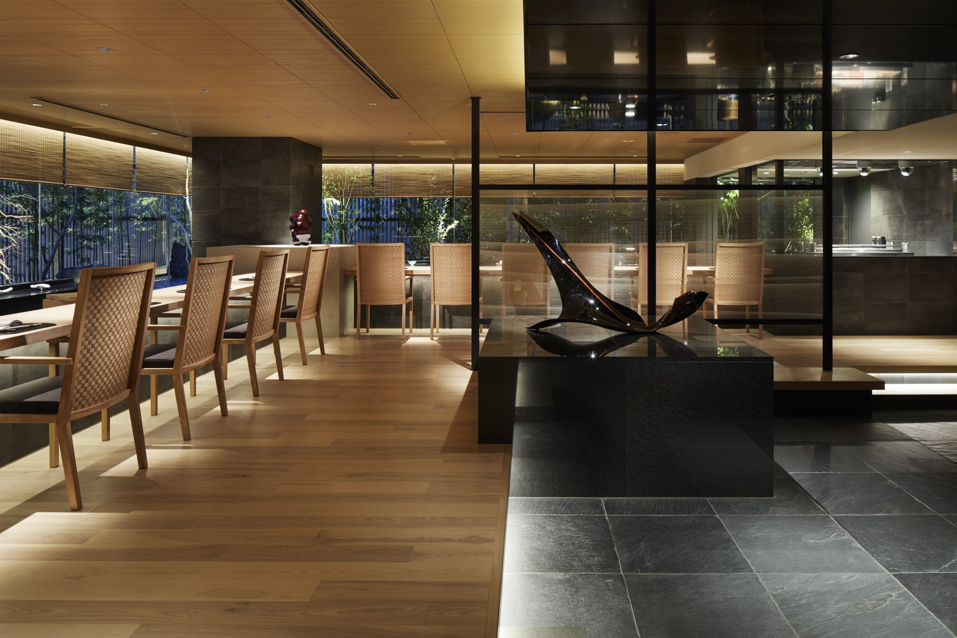 静謐な空間が広がる日本料理「KIZAHASHI」のカウンターで、和食とワイン・日本酒を深く味わう2つのサロン。