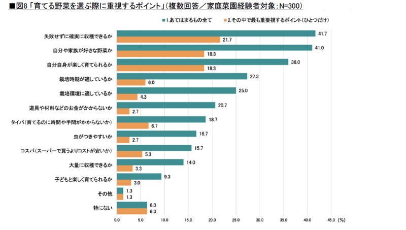 「初めて育てた野菜」と「リピートして育てたい野菜」に加えて、「上級者と中級者が育てやすくて初心者におすすめしたい野菜」も、トップ5までを同じ品目が占めた。「育てる 野菜を選ぶ際に重視するポイント」は、「失敗せずに確実に収穫できるか(41.7%)」、「自分や家族が好きな野菜か(41.0%)」、「自分自身が楽しく育てられるか(36.0%)」が上位となった。