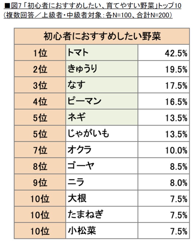 そのほか、暑い夏にも育てやすい「オクラ(10.0%)」「ゴーヤ(8.5%)」、一度植えると数年収穫ができる多年草の「ニラ(8.0%)」、収穫の達成感が大きい「大根」「たまねぎ」、生育が早く育てやすい「小松菜」(いずれも7.5%)が続いています。