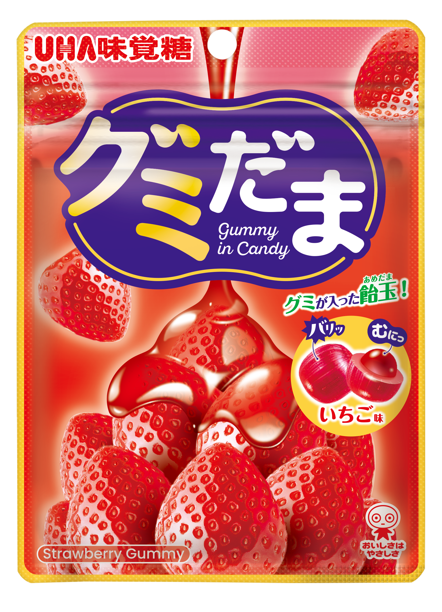 むにっと食感のグミを、キャンディでコーティング。キャンディを極限まで薄くし、グミの配合比率を高めることで、バリッと噛みやすく、中からむにっとグミが出てくるよう仕上げました。