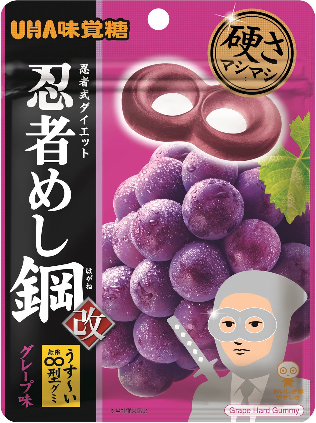 シリーズとして忍者めしのハードな食感はそのままにグミの形が「∞」型の「忍者めし鋼」も発売中。そのまま噛んだり、折りたたんで噛んだり、無限大の噛み方をお楽しみいただけます。