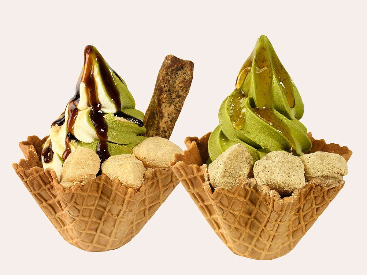 『桔梗信玄ソフト吟造り+恋い抹茶』は、濃い抹茶ソフトにプレミアム桔梗信玄餅吟造りをトッピング!きな粉は丹波種の黒豆を使用。ハチミツは、オリジナルの黒蜜にアカシアの蜂蜜をブレンドしており、お餅は砂糖の量を減らし甘さ控えめに。まるで専門店で食べる“和風パフェ”のようなリッチな味わいが特徴です。