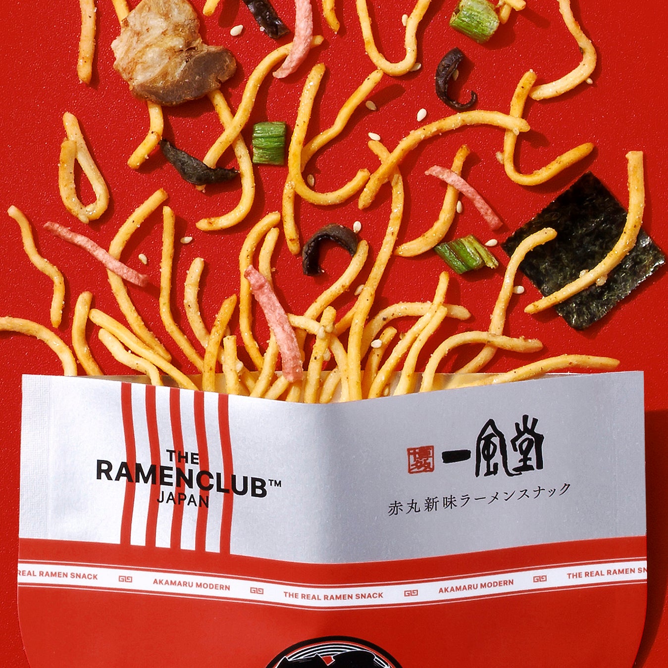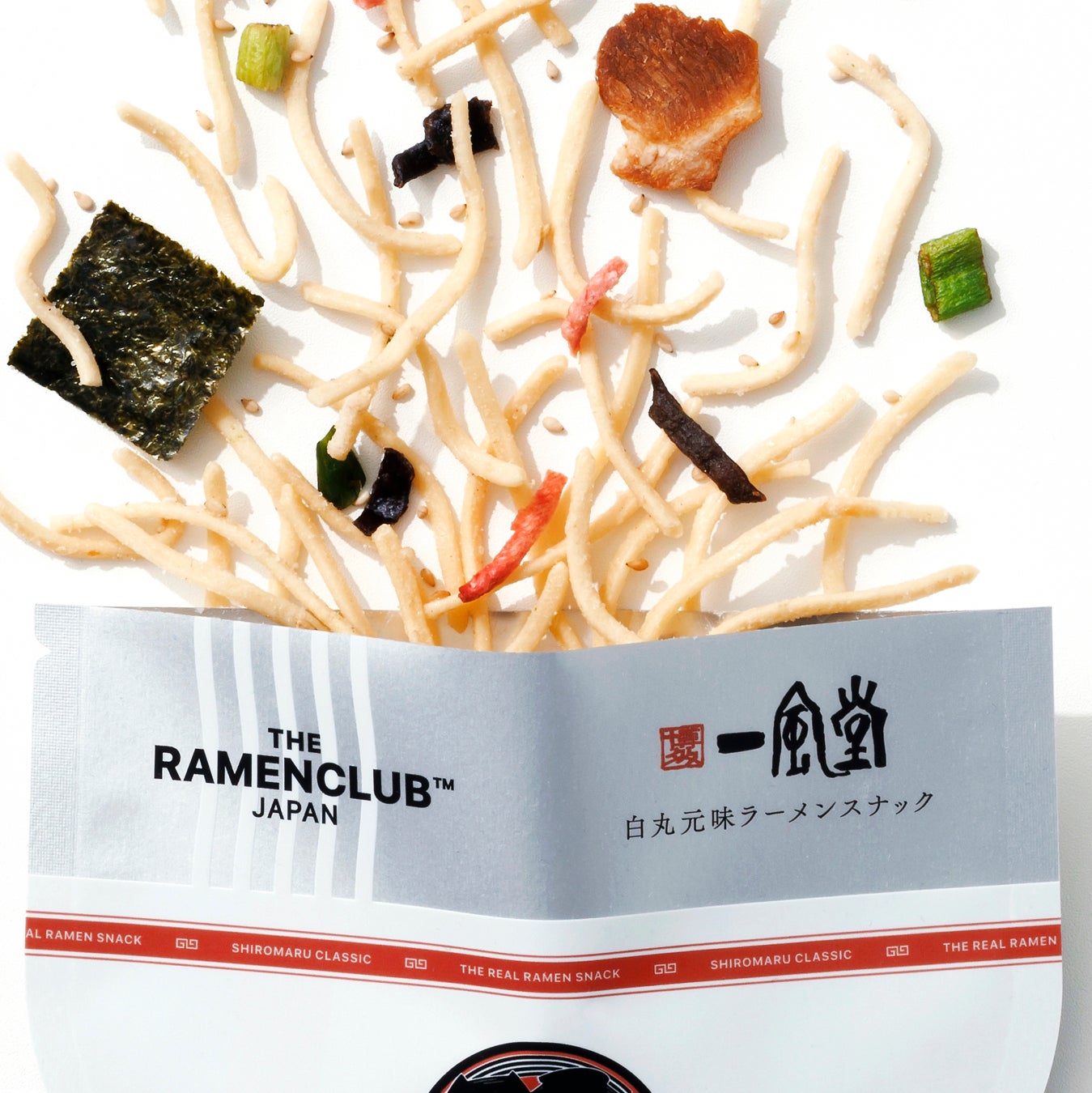 そして、この度、ラーメンを語る上で欠かせない“博多”という地に着目しました。とんこつラーメンのパイオニアであり、日本のラーメン文化を世界へ広めた博多一風堂とともに、博多一風堂の味を再現したラーメンスナックを共同開発。新たな形で博多の味を届ける商品が誕生いたしました。今回発売する新商品は「白丸元味ラーメンスナック」、「赤丸新味ラーメンスナック」 の2種類です。博多一風堂の最大の特徴である、臭みがなくマイルドでコクのある豚骨スープと、博多らしい極細ストレート麺を再現し、口の中でスープが広がる新感覚のラーメンスナックとして仕上げました。RAMEN CLUBがラーメン専門店と共同開発をするのは今回が初めてとなります。