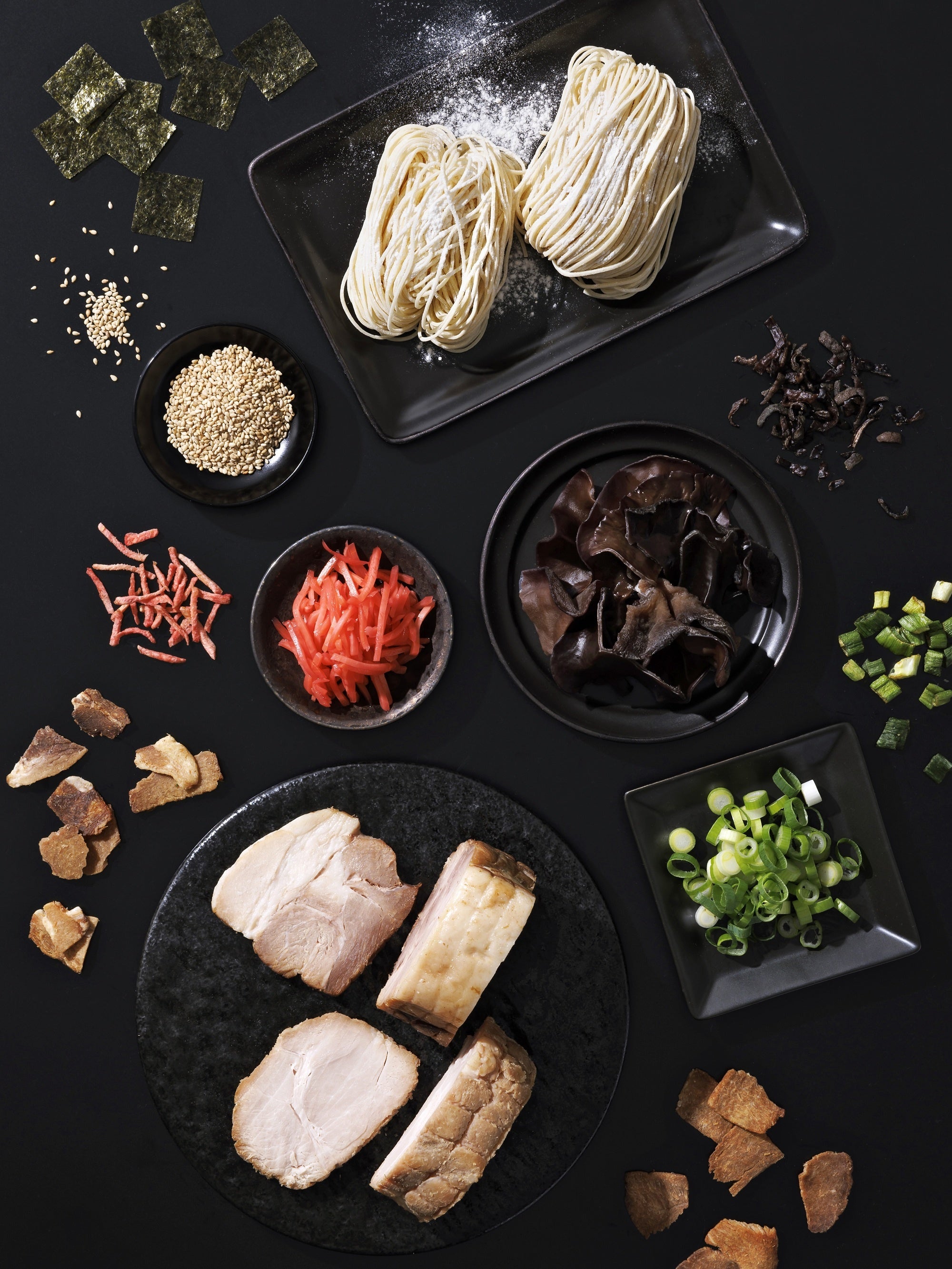 博多とんこつラーメンには欠かせない紅しょうが、ネギ、きくらげ、精肉店と開発したチャーシューをトッピング。白ごまをまとわせ、焼のりも添えています。
