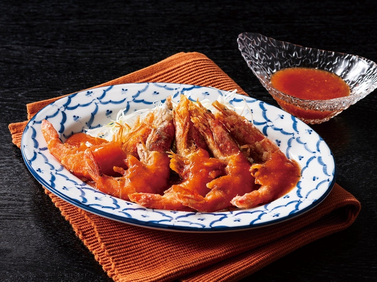 丸ごと殻まで食べられる有頭海老と、甘辛いチリソースが絶妙!