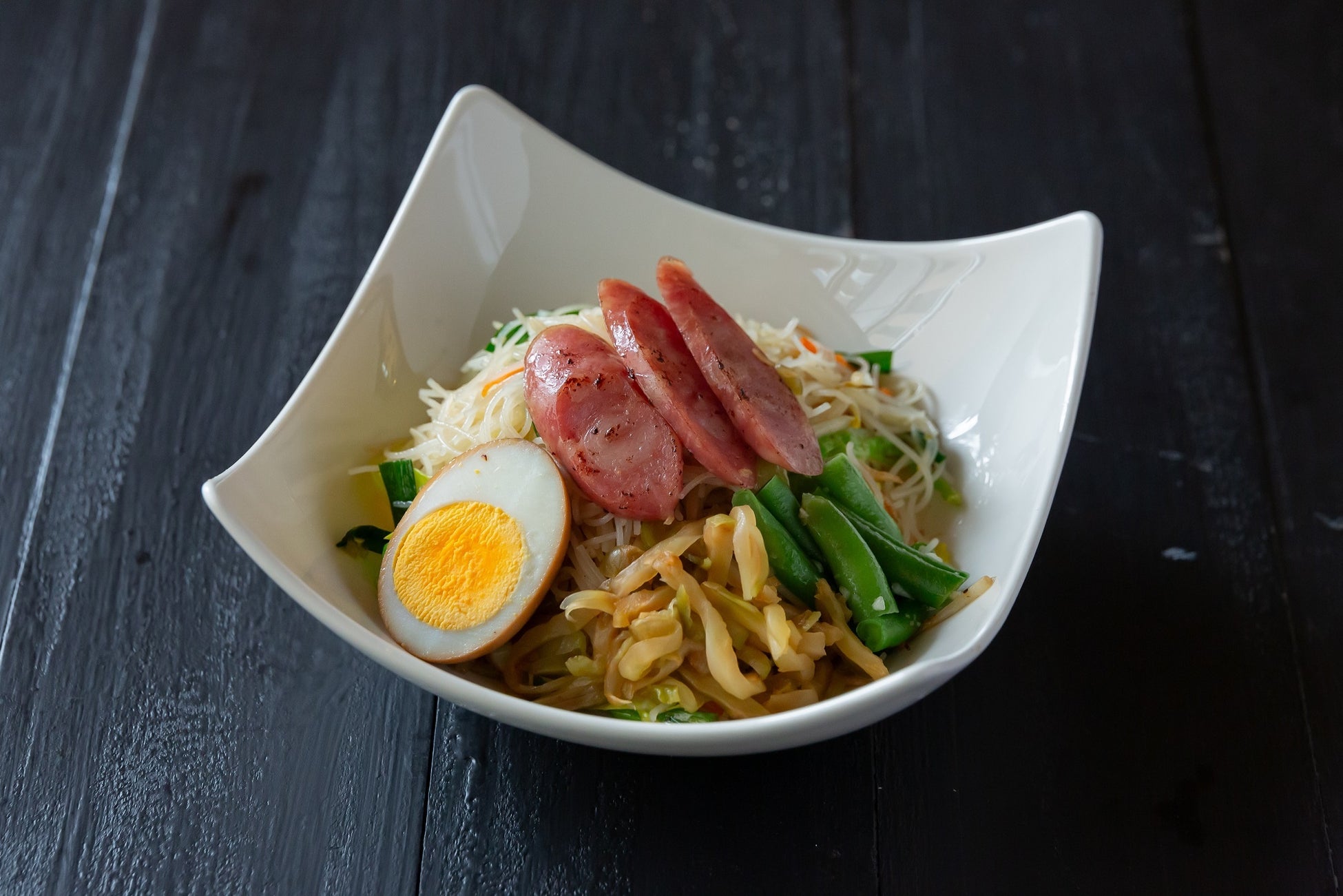 台湾の腸詰「香腸(シャンチャン)」を焼ビーフンにトッピング。アクセントに搾菜