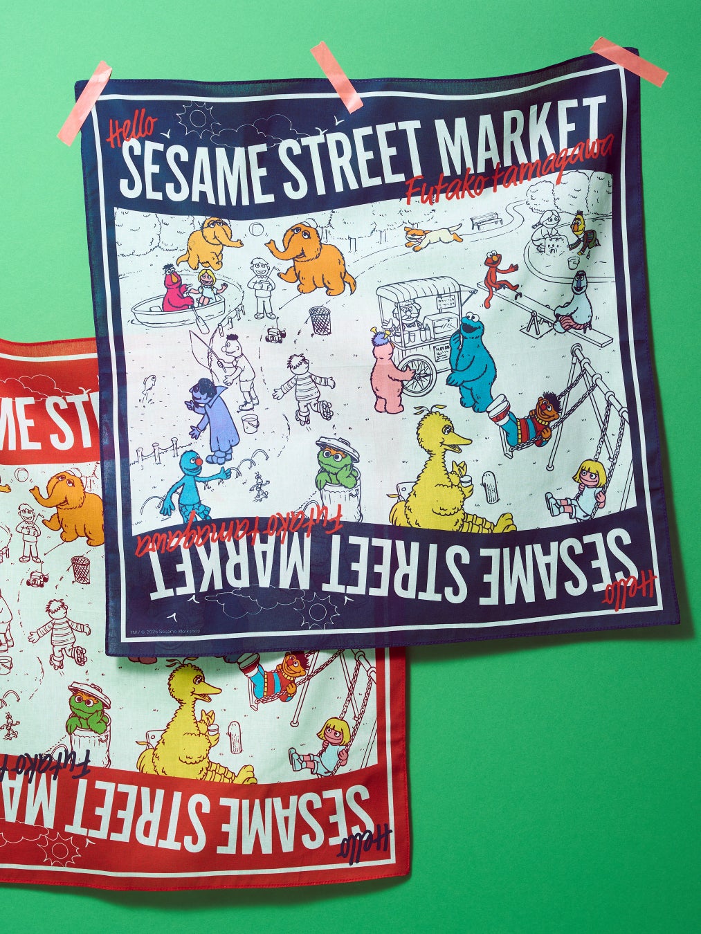 水辺に広がる景色や緑あふれる自然豊かな二子玉川の公園で、セサミストリートの仲間たちが大集合し、みんなで仲良くのびのびと遊ぶ様子を描いたバンダナ。スタイリッシュなネイビーと差し色としても映えるレッドの2カラー展開で、首元や髪、バッグに結んでアクセサリーとして使ったり、お弁当包みとして活用したりと、様々なアレンジが楽しめる万能アイテムです。