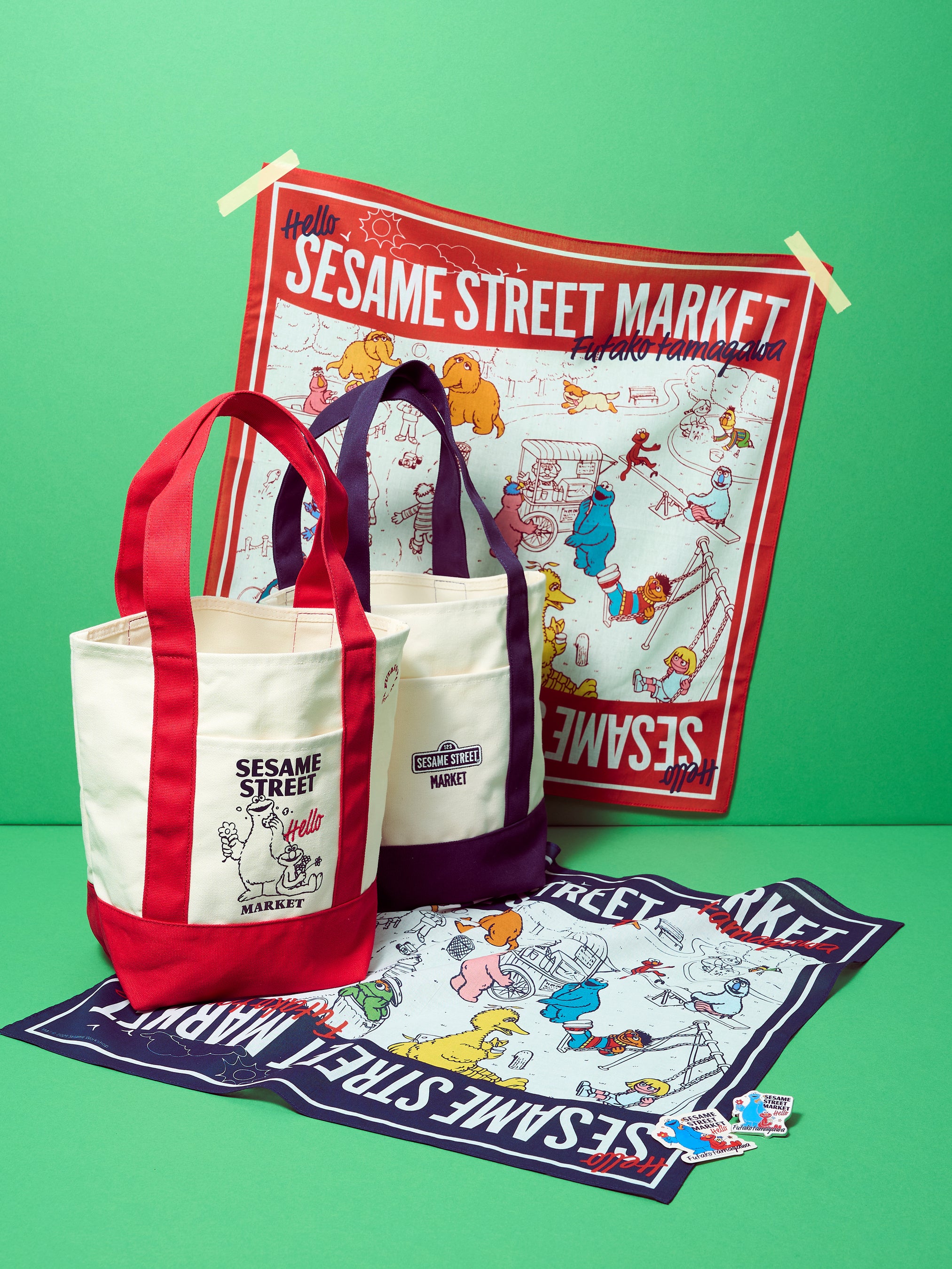 ラインアップには、バイカラーデザインが特徴のトートバッグをはじめ、セサミストリートの仲間たちが大集合したイラストが目を惹くバンダナ、さらにピンバッジやステッカーを取り揃えました。トートバッグとバンダナは、スタイリッシュなネイビーと差し色としても映えるレッドの2カラー展開で、日常に取り入れやすいカラーリングも見どころのひとつです。