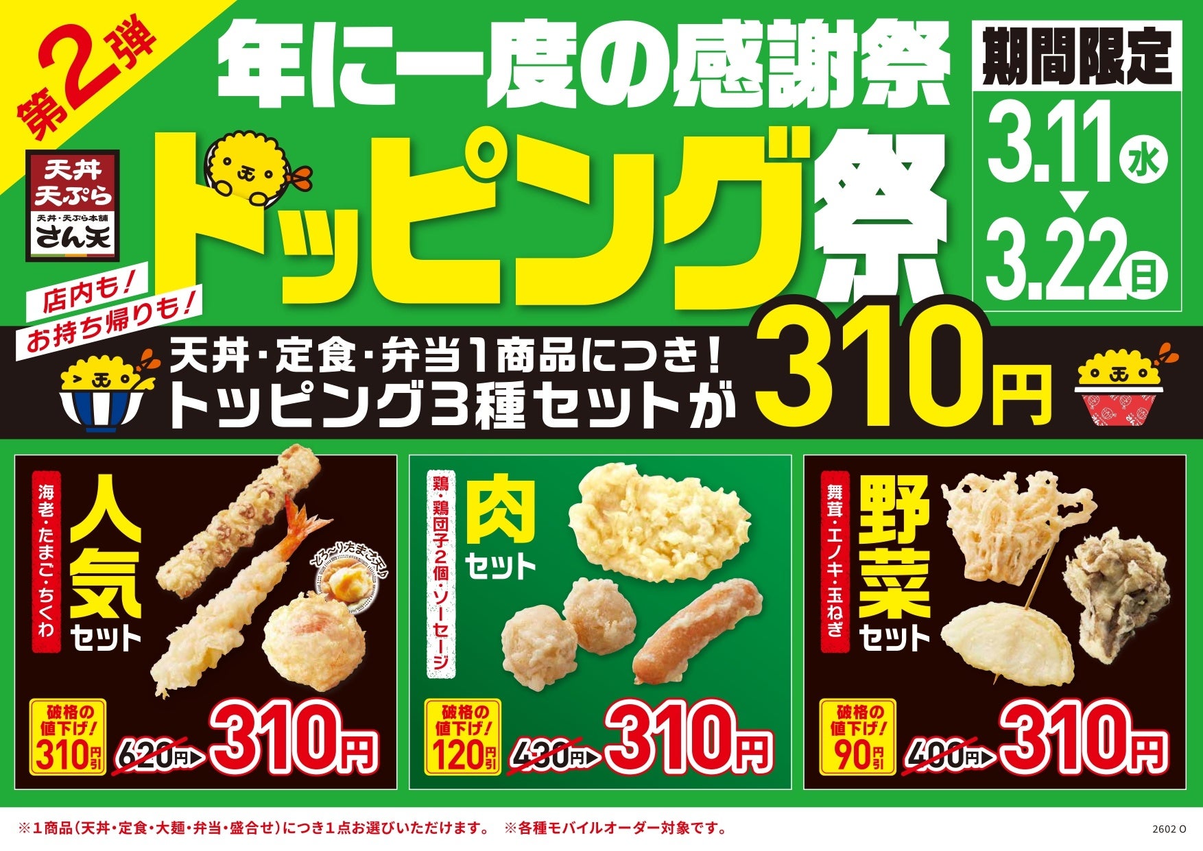 サトフードサービス株式会社(本社・大阪府大阪市、代表取締役執行役員社長・杉本 貴之)が運営する「天丼・天ぷら本舗 さん天」では、2026年3月6日(金)から、日頃のご愛顧に感謝を込めて「年に一度の感謝祭」を開催します。第1弾は2026年3月6日(金)~2026年3月10日(火)まで「天丼3品590円祭」を開催します。対象天丼が最大200円引きになるお得なキャンペーンです。第2弾は2026年3月11日(水)~2026年3月22日(日)まで「トッピング祭」を開催します。天丼・定食・弁当を購入でおすすめトッピング3個1セットがお得に購入できます。ボリューム満点のトッピングセットは全3種類ご用意しておりますので、お好みのトッピングをお楽しみいただけます。