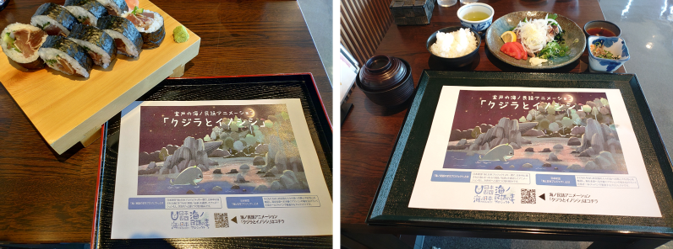 シートのデザインには、室戸の世界ジオパークの象徴である「タービダイト(地層)」が広がる浜辺に、クジラが寄り添うメインビジュアルを採用しました。地域の民話を、お食事と一緒にぜひお楽しみください。