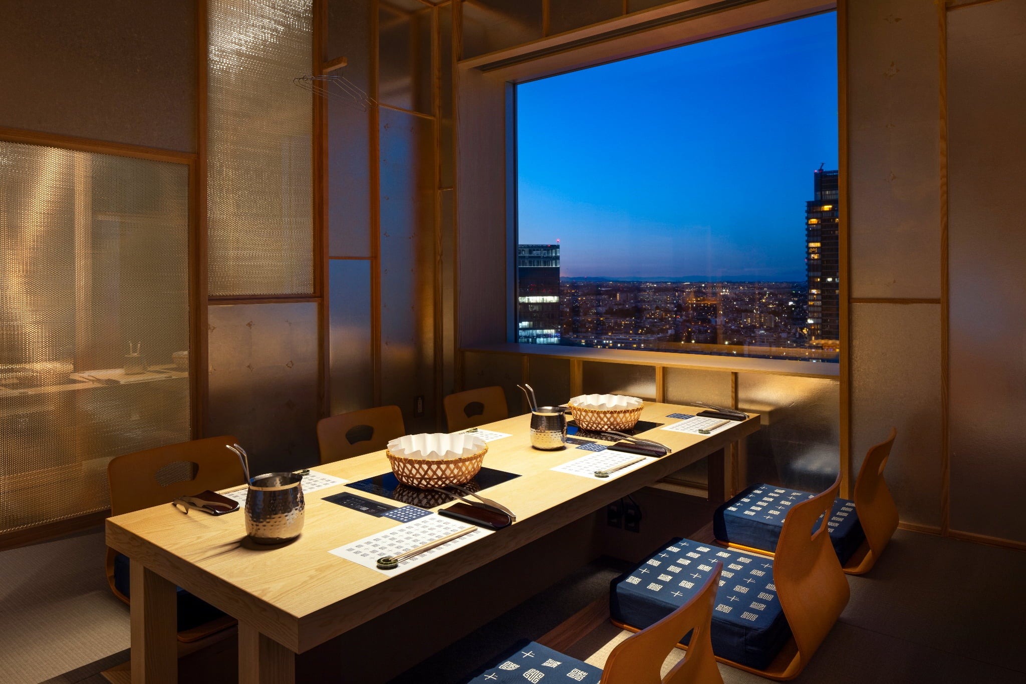 店内は伝統的な日本の美を受け継ぎながらも洗練されたデザインで、ゆったりとお寛ぎいただける上質な空間です。店内の2面が窓張りになっており、横浜店限定の景色が見える大人数用の個室や、窓に面したテーブル席・掘りごたつ席、最大40名様までご利用いただける大広間も完備しております。