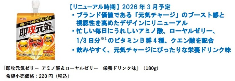 株式会社 明治(代表取締役社長:八尾 文二郎)は、「即攻元気ブランドより、 元気をチャージする「 即攻元気ゼリー アミノ酸&ローヤルゼリー 糖類0 コーラ風味 」を2026年3月9日よりコンビニエンスストアにて先行発売し、3月23日より全経路にて発売します。