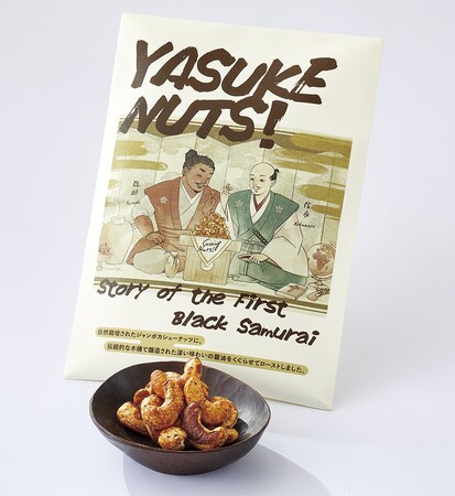 新商品 「 YASUKE NUTS! (ヤスケナッツ)」 は、 2025 年の大阪・関西万博 モザンビークパビリオン公式販売商品として誕生した特別なナッツ。戦国時代に織田信長に仕えた世界初の黒人サムライ「弥助」の物語から着想を得て、弥助の堂々とした存在感を表す特大カシューナッツを、滋賀県産の伝統的な木桶醤油にくぐらせて丁寧にローストした逸品です。醤油の深い味わいとカシューナッツの甘みが絶妙に融合し、他にはない香ばしさが楽しめます。