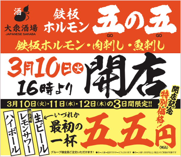 海鮮居酒屋「磯丸水産」をはじめ、多数の飲食店を運営する SFP ホールディングス株式会社(本社:東京都世田谷区 代表: 佐藤誠)は、2026年3月10日(火)に「鉄板ホルモン五の五 川越店」をオープンいたします。