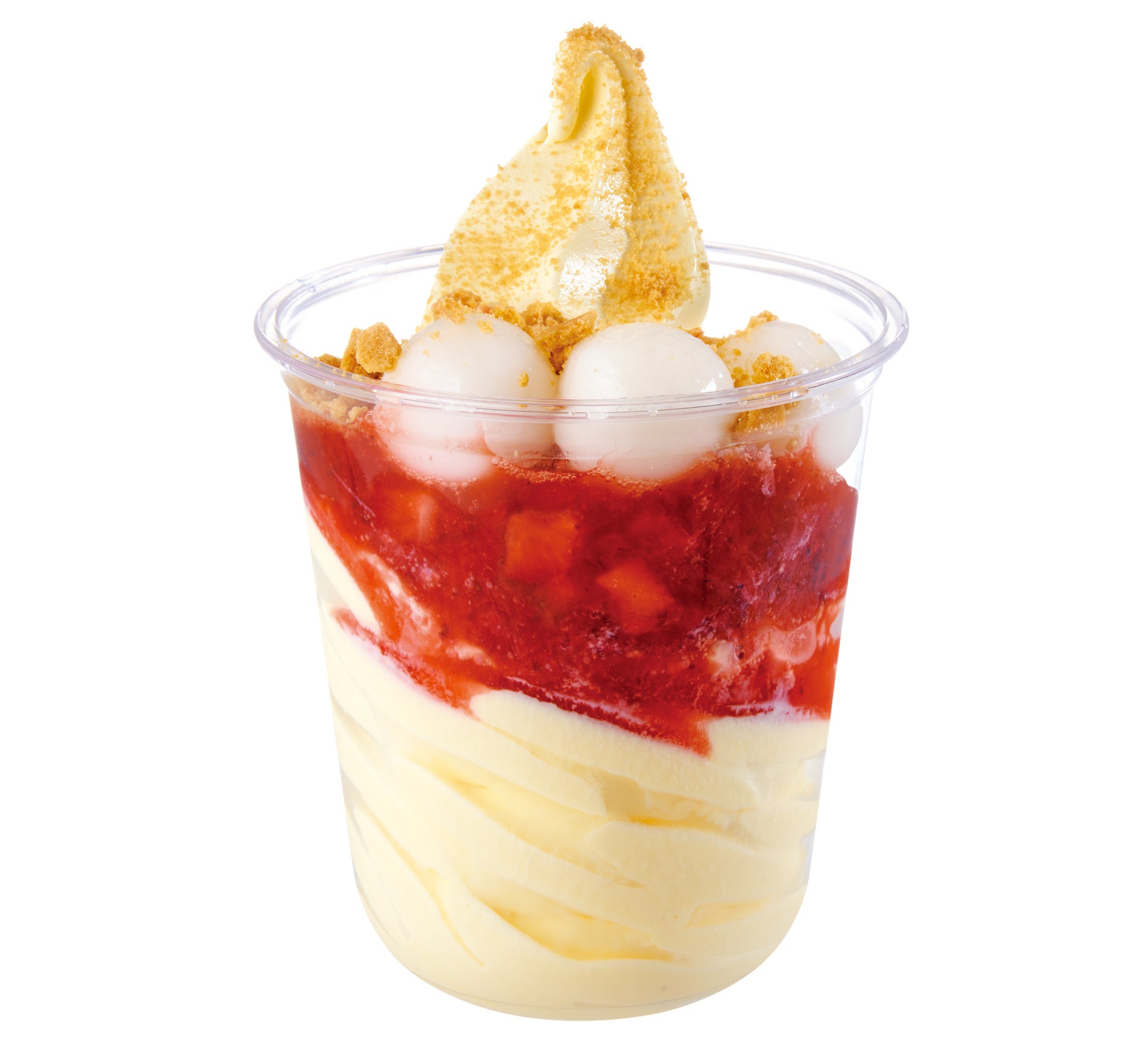 濃密なバニラを感じられるオリジナルソフトクリームに、果肉感のあるなストロベリーソースをトッピング!もちもちの白玉とクラッシュサブレの食感も楽しい豪華なパフェ。
