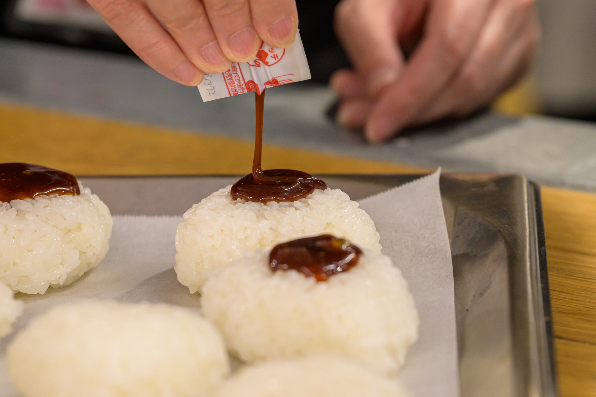 株式会社大森屋の「おうちで焼きおに」を使い、おにぎりに塗るだけで香ばしい本格的な味わいが完成するスプレッドの簡便さを体験。