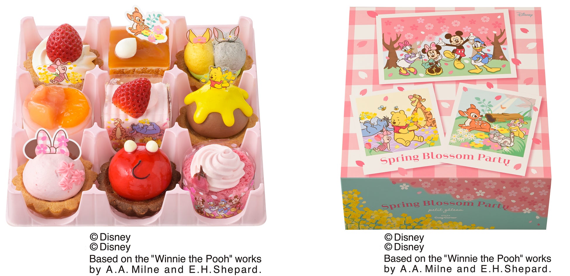 特長:「ミッキーマウス」と仲間たちがお花見を楽しんでいる様子を、9つのプチケーキにデザインしました。「ミッキーマウス」はトレードマークの赤いズボンをラズベリーグラサージュで仕上げたタルトで、「バンビ」はプリン風味ホイップクリームとオレンジ風味スポンジのケーキでそれぞれ表現。パステルカラーの愛らしいスイーツで春をお楽しみください。