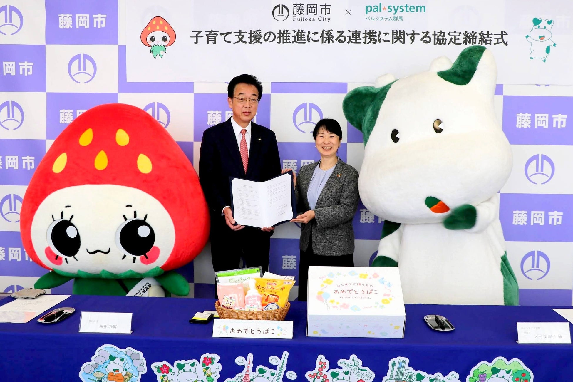 生活協同組合パルシステム群馬(本部:高崎市中大類町、理事長:大平真紀子)は2月中旬から下旬にかけて、板倉町(小野田富康町長)、藤岡市(新井雅博市長)、東吾妻町(中澤恒喜町長)、千代田町(高橋純一町長)、玉村町(石川眞男町長)の5市町と「子育て支援の推進に係る連携に関する協定」を締結しました。協定に基づき、申請した子育て世帯へ育児に活用できる商品を詰め合わせた「おめでとうばこ」のプレゼントを開始します。行政と生協の協同により、子育て応援サービスを地域の誰もが受け取れる環境づくりを推進します。