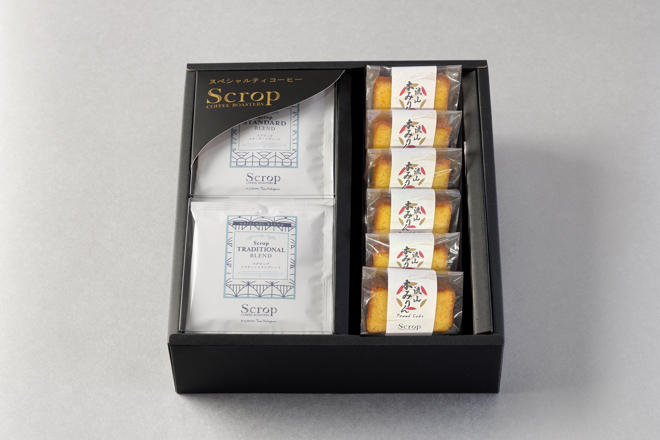 流山本みりん&こぼれ梅のパウンドケーキと、Scrop定番ブレンドのドリップバッグを詰め合わせたギフトセットです。本みりんとこぼれ梅を加えて焼き上げたパウンドケーキは、しっとりとした口あたりとやわらかな甘み、バターの香りが特長です。