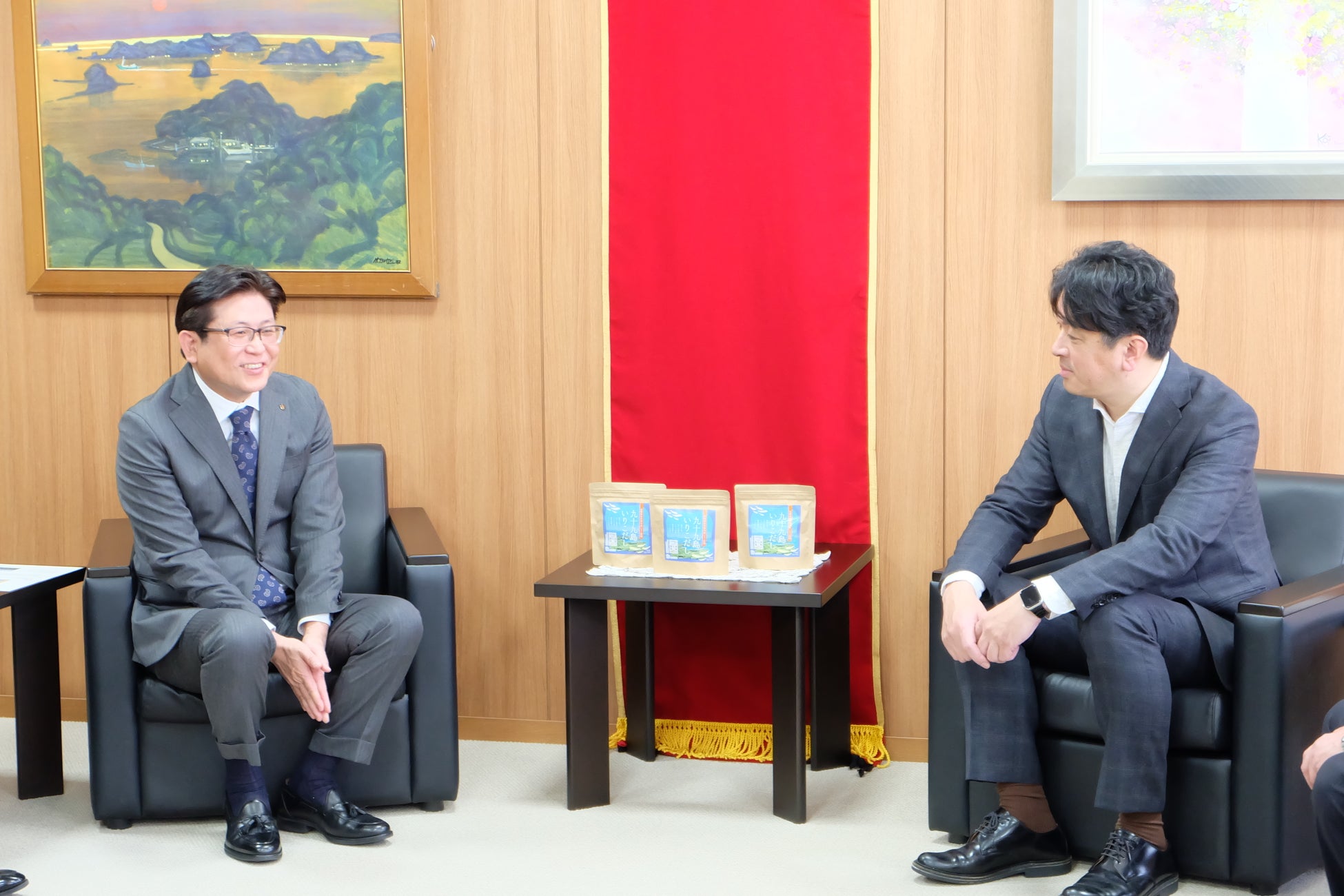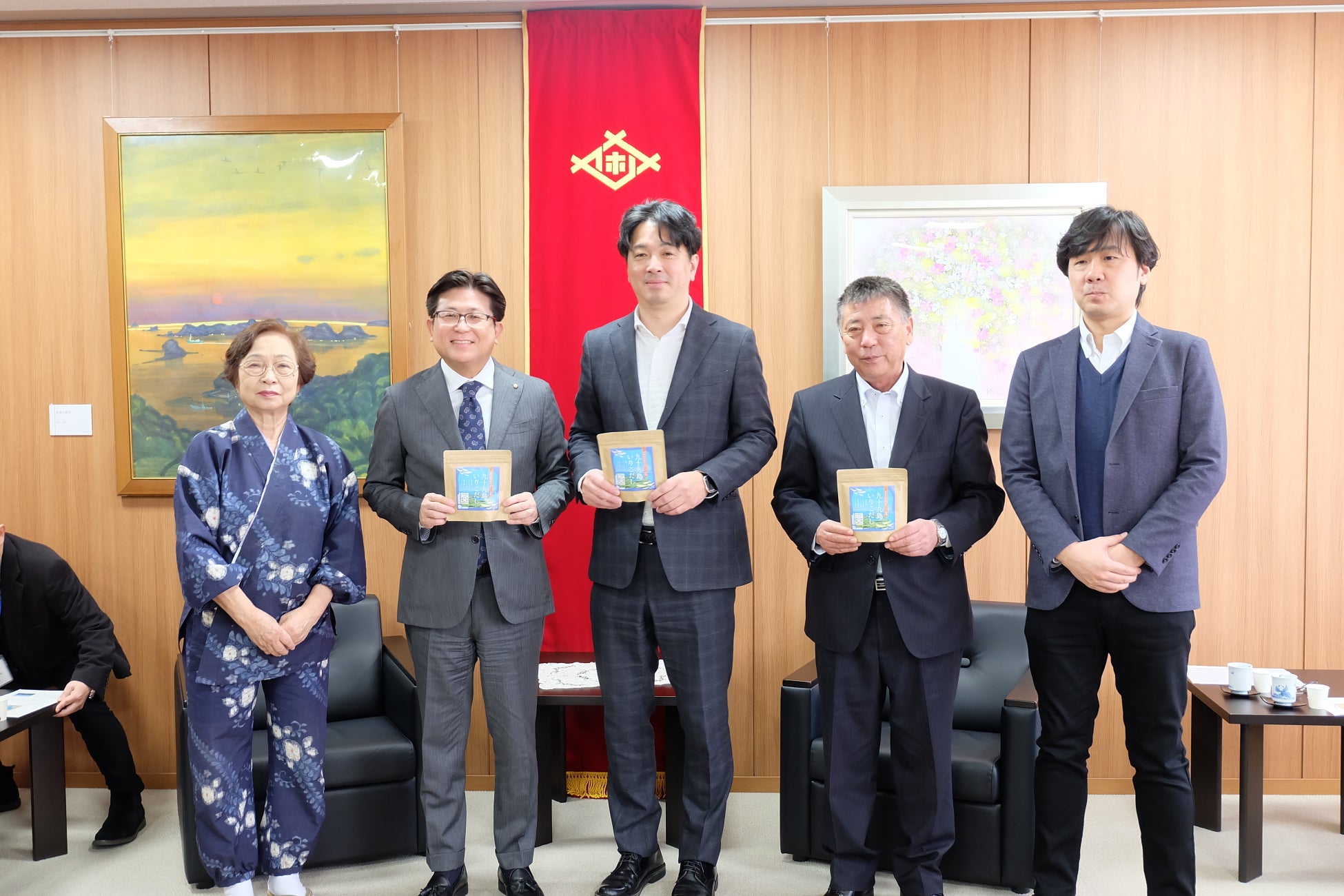 この度、当社は市内の事業者である九十九島漁業協同組合(以下「九十九島漁協」)と有限会社まさるフーズ(以下「まさるフーズ」)の2社をサポートし、「九十九島いりこだし」を開発しました。2月12日(木)には佐世保市の宮島大典市長に報告を行い、3月1日(日)より長崎県内を中心に42店舗を展開するエレナ全店での販売が決定し、この後、佐世保市のふるさと納税返礼品としても登録される予定です。