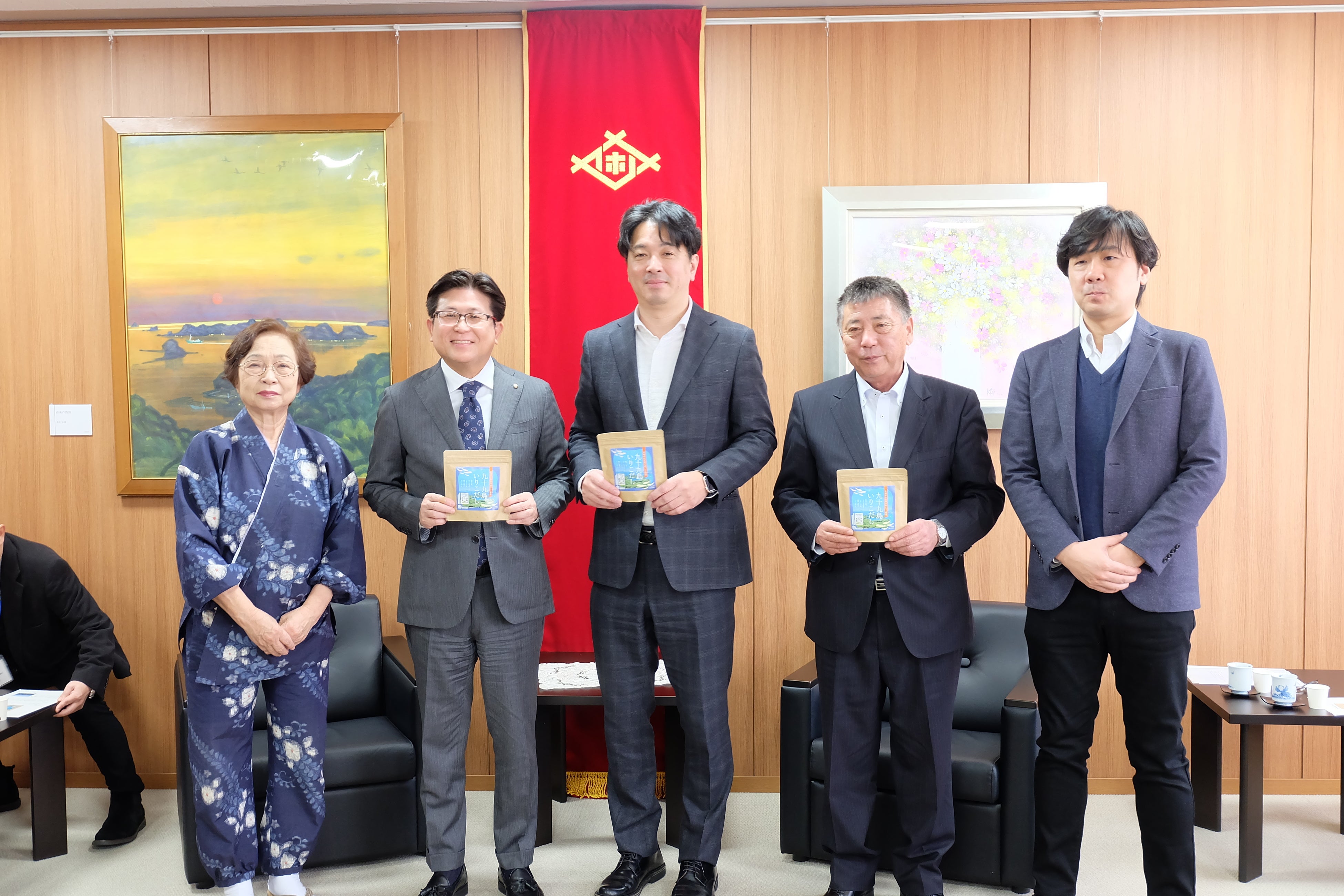 商品の発売に際し、2月12日(木)、関係各社が揃って佐世保市の宮島大典市長に報告に伺いました。当日は、市長にご試飲いただき「佐世保の人はいりこ出汁が美味しいことは小さい頃から植え付けられているが、全国には出汁の美味しさがなかなか届かない状況があるのではないかと思っています。この地域に眠っている美味しい食材をこのように磨き上げていただきありがとうございました。市としても積極的にバックアップしていきます」と言葉をいただきました。