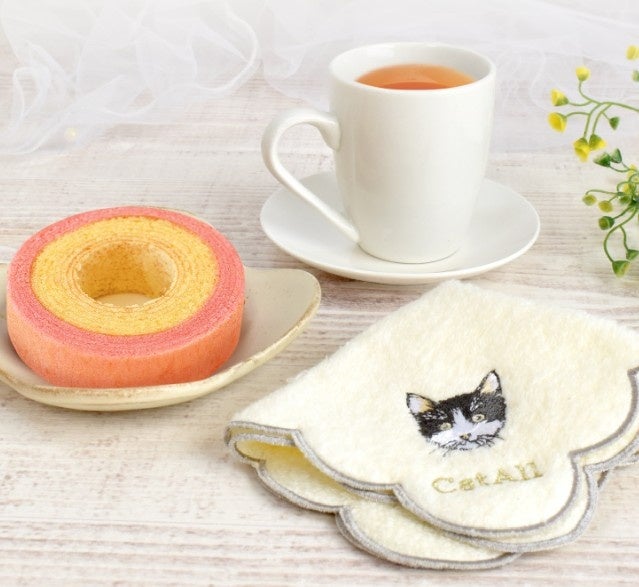 ギフトにはハンカチに加え、苺バウムクーヘンと紅茶をセットにしました。