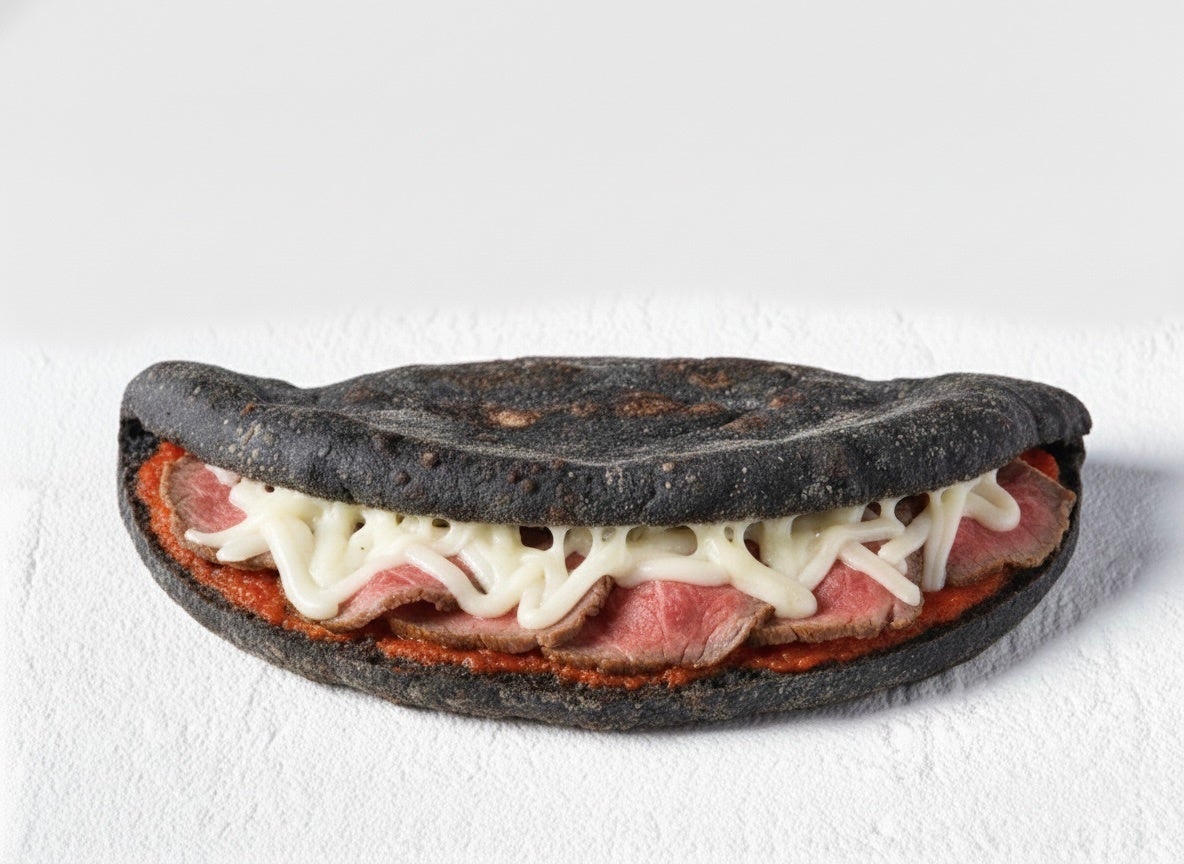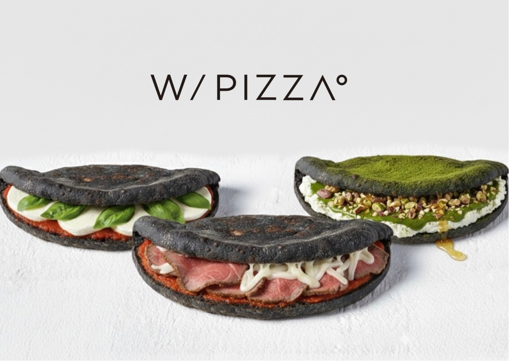 自家製の竹墨ブラック生地を使用した、ワンハンドで食べられるピザを提供するテイクアウト専門店です。片手で持てるサンド型構造に設計されたピザは、味だけでなく、持ち方・温度・構造までを含めた“体験”として再構築されています。本プロジェクトでは、W / PIZZA° のオープンに先駆け、