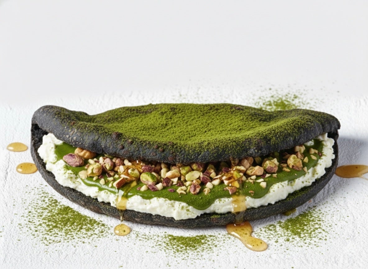 竹墨ブラック生地に、抹茶クリームを合わせたデザートピザです。
