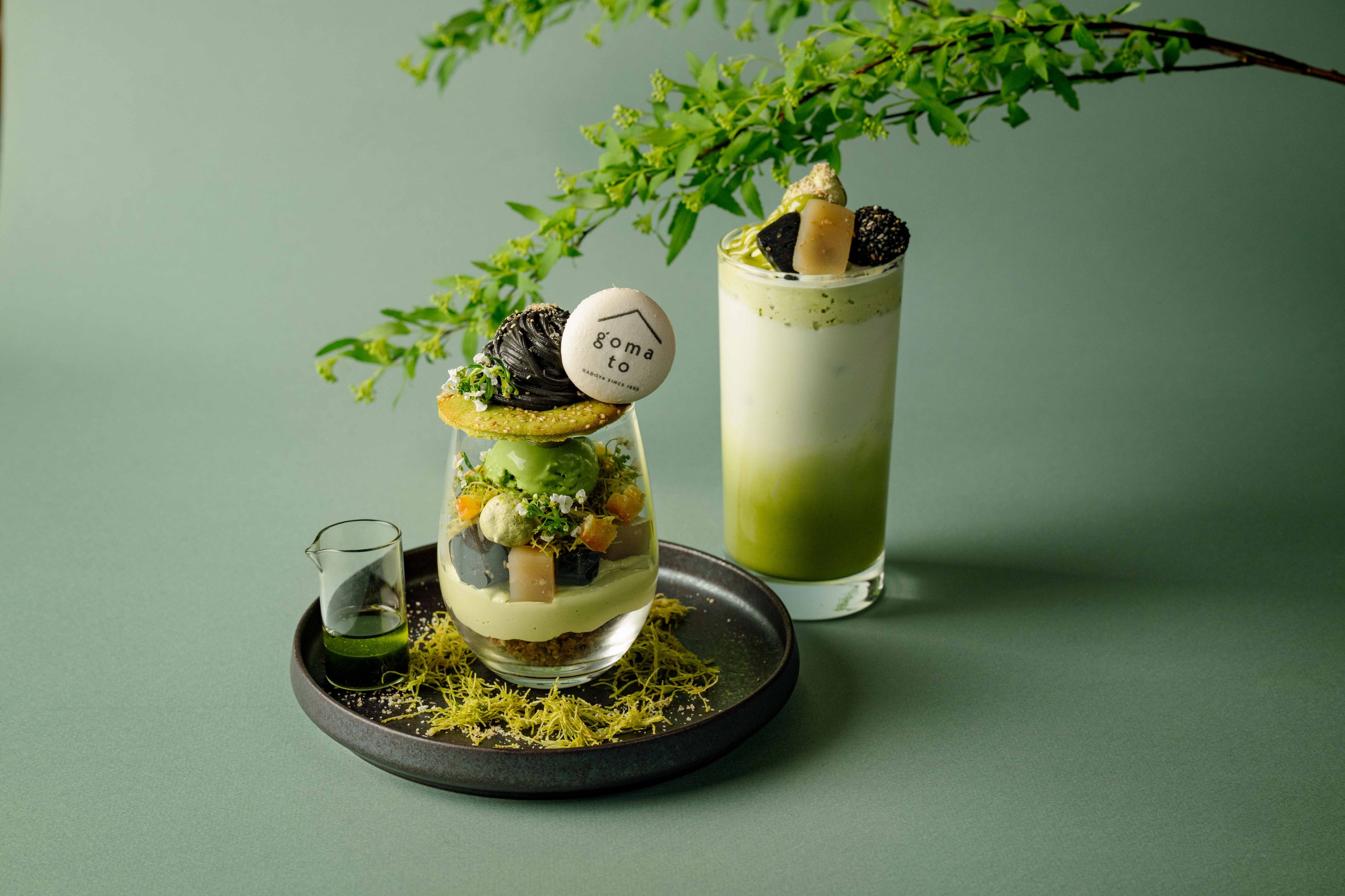 香り豊かな抹茶に、goma to ようかんと黒いりごまで仕上げたごま白玉を添え、ひと口ごとに異なるごまの風味を楽しめる一杯に仕上げました。