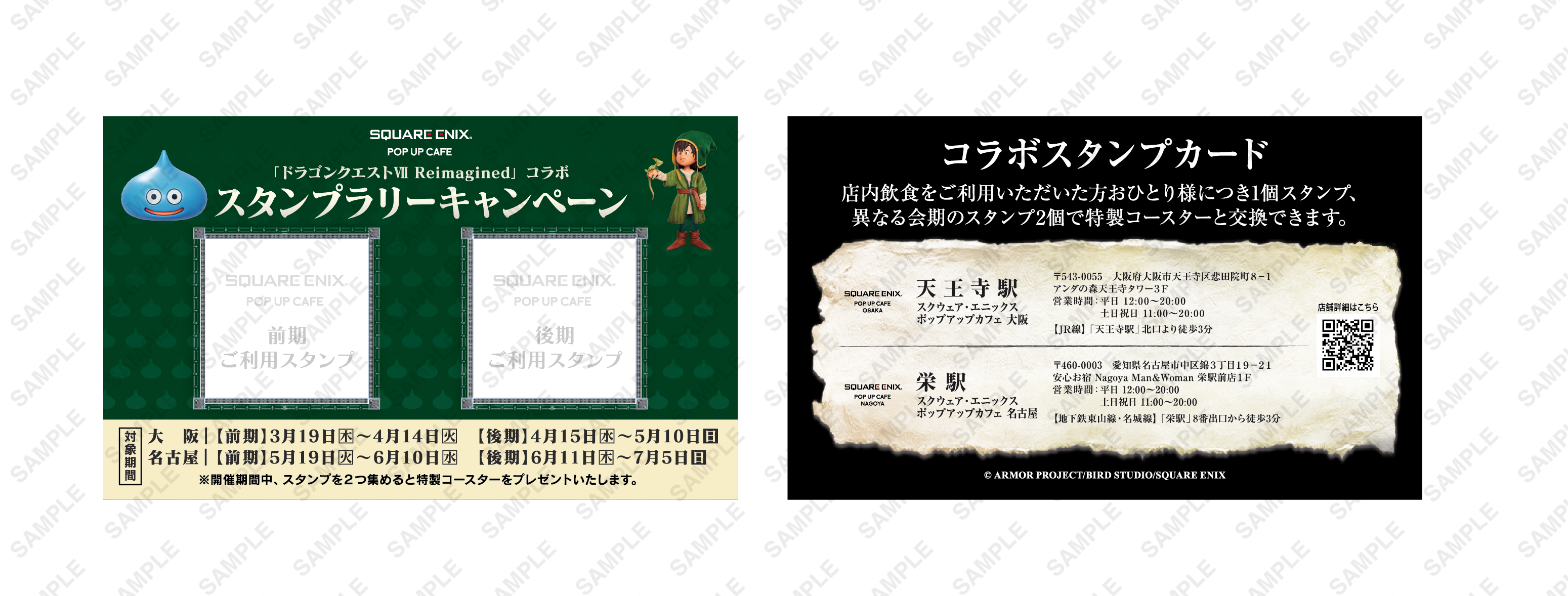 コラボ開催期間中、 『SQUARE ENIX POP UP CAFE』大阪・名古屋を前期・後期にそれぞれ1回ずつご利用いただき、異なる会期のスタンプを2つ集めたお客様には、オリジナルクリアコースターをプレゼントいたします。