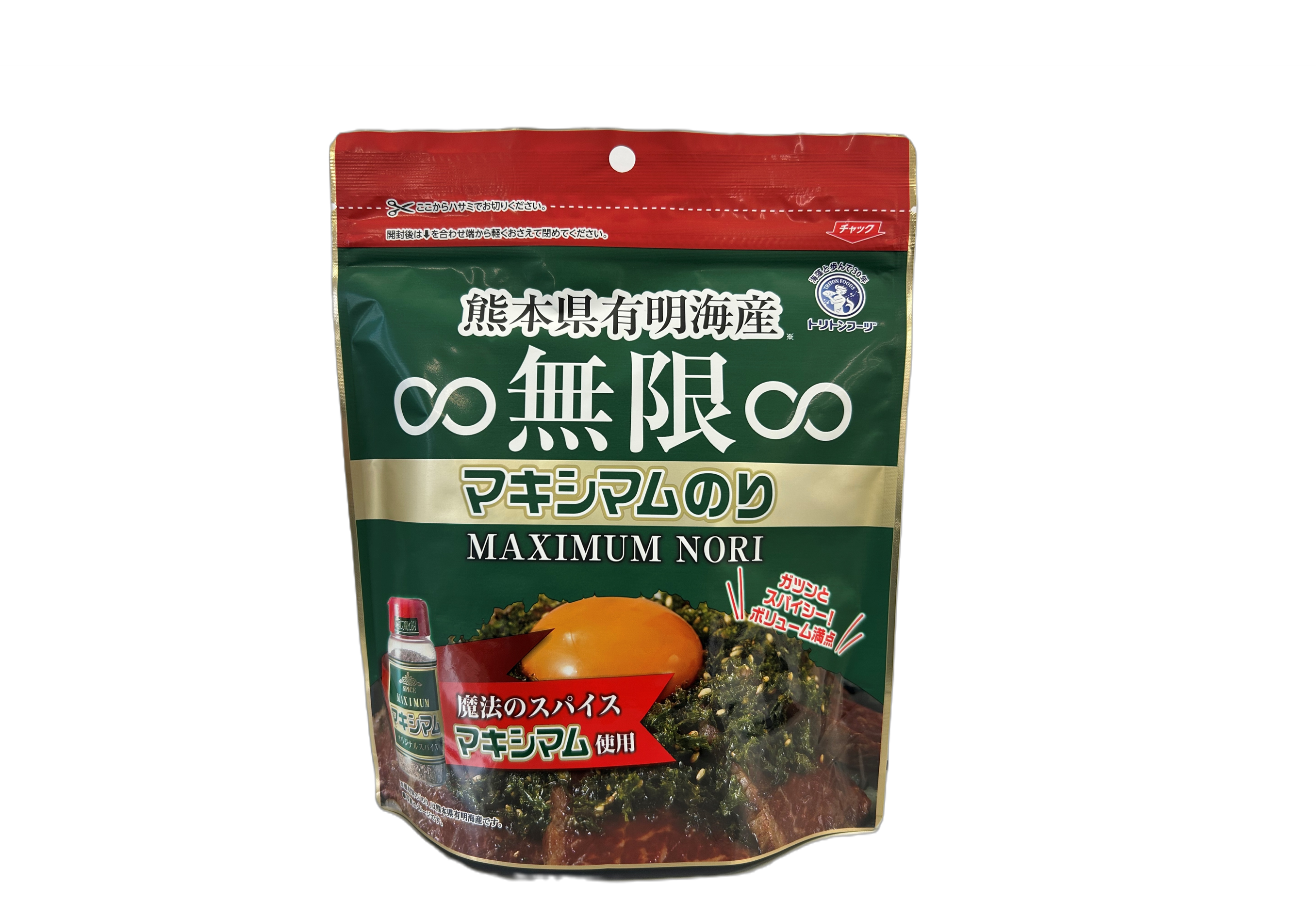 株式会社トリトンフーヅ(本社:熊本県宇土市城塚町169-1、代表取締役社長:髙木 良樹)は、熊本県有明海産の香り高い海苔に、宮崎発祥の魔法のスパイス「マキシマム」のパンチをプラスした、「熊本県有明海産∞無限∞マキシマムのり」を2026年3月1日より全国のスーパーマーケットなどで順次発売しております。
