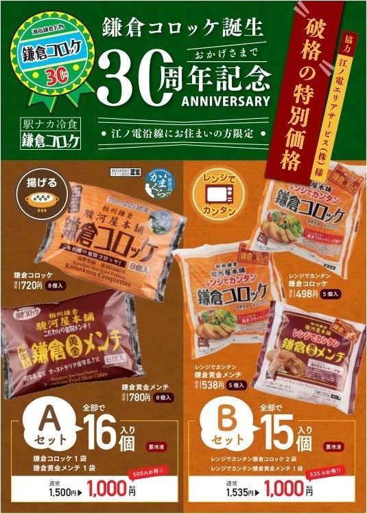 株式会社駿河屋本舗(本社:神奈川県鎌倉市 代表取締役:丸山均)は、看板商品『鎌倉コロッケ』の誕生30周年を記念し、江ノ電エリアサービス株式会社の協力のもと、2026年3月9日(月)より江ノ電鎌倉駅構内の「江ノ電鎌倉駅本店」にて、沿線住民の方々を対象とした「30周年記念 地元還元特別販売」を実施いたします。日頃の感謝を込め、通常価格1,500円以上の人気冷凍セット2種を、各税込1,000円の特別価格で販売。2月にリニューアルしたばかりの店舗にて地域の皆様をお迎えいたします。